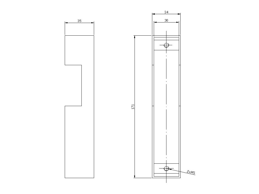 Kazeta prispôsobená pre úchyty R2. Vyrobená z plechu o hrúbke 2 mm. V sade sú dva skrutky M5x14 slúžiace na pripevnenie úchytu. Povrch poskytuje dobrú prípravu na nanášanie farieb, najmä práškových alebo zinkovania.