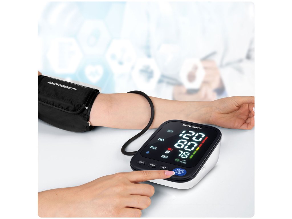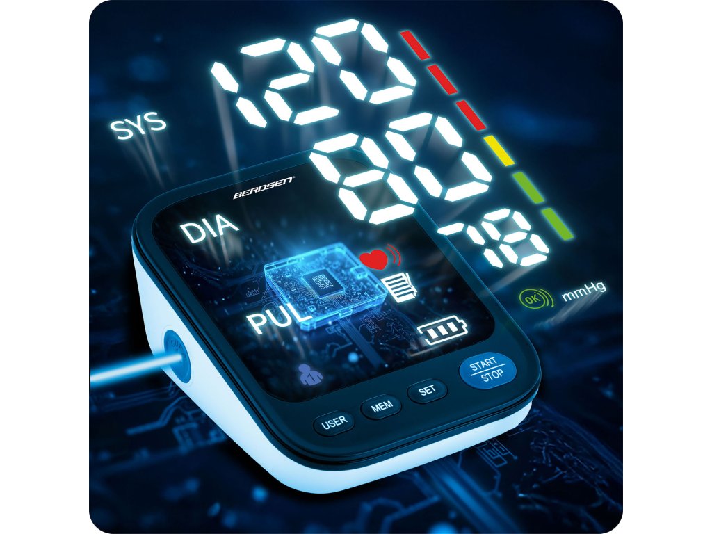 Niezawodny miernik ciśnienia krwi z polskimi komunikatami ✅ Nowoczesny i funkcjonalny Wykrywa nieprawidłowości pomiaru. Informuje o nieregularnym biciu serca. Pamięć aż do 398 pomiarów - 2 użytkowników. Czytelny wyświetlacz LED. ✅ Łatwy w obsłudze Polski i angielski lektor (ustawienia) Etui w zestawie do łatwego przechowywania. Wygodny rękaw z regulacją — od 22 do 42 cm obwodu ramienia. Skala pomiaru ciśnienia dla łatwej interpretacji wyników. Polski lektor i wygodna obsługa! ✅ Czytelne komunikaty głosowe po polsku – urządzenie mówi krok po kroku, co robić, dzięki czemu obsługa jest prosta nawet dla osób starszych lub niedowidzących. ✅ Lepsze zrozumienie wyników – głosowe odczyty wartości ciśnienia i pulsu to wygoda i pewność pomiaru. ✅ Idealny dla seniorów – nie trzeba odczytywać cyfr z ekranu, co ułatwia codzienne korzystanie z ciśnieniomierza. ✅ Ciśnieniomierz BERDSEN™ z czytelnym wyświetlaczem LED i polskim lektorem Do codziennych pomiarów dla całej rodziny. Niezwykle funkcjonalny i łatwy w obsłudze. Łatwa obsługa i szybki wynik Skurczowe ciśnienie krwi. Rozkurczowe ciśnienie krwi. Tętno — wynik pomiaru tętna. Użytkownicy. USER — przełączenie użytkowników. MEMORY — zapisane pomiary. SET — ustawienia. Przycisk START/STOP — uruchamia lub zatrzymuje urządzenie i pomiar. Wykrywanie poprawnego założenia mankietu. Skala pomiaru. ✅ Jak prawidłowo zbadać ciśnienie? Usiądź wygodnie, opierając plecy o oparcie. Ręce oprzyj o stół lub podłokietniki. Nie pij napojów z kofeiną 30 min przed pomiarem. Nie pal papierosów do 30 min przed badaniem. Pomiary wykonuj codziennie o tej samej porze dnia. Każdy pomiar powtórz 3 razy i wyciągnij średnią z tych pomiarów. Pomiędzy pomiarami odczekaj 1 minutę. Zapisuj codziennie pomiary. Jak prawidłowo odczytać parametry ciśnienia na wyświetlaczu? Prawidłowe ciśnienie występuje gdy jego wartości wahają się w granicach 100–139/60–89 mmHg. Za idealne uznaje się ciśnienie 120/80 mmHg. 1. Ciśnienie skurczowe: Jest najwyższą liczbą — to ciśnienie, podczas którego Twoje serce się kurczy, pompując krew do ciała. 2. Ciśnienie rozkurczowe. Jest najniższą liczbą — to ciśnienie pomiędzy uderzeniami, gdy Twoje serce się odpręża. ✅ Kompletny zestaw Ciśnieniomierz Mankiet na ramię Torba do przechowywania 4 baterie AAA Instrukcja obsługi ✅ Zakresy pomiarów Ciśnienie skurczowe: 57 mmHg - 255 mmHg Ciśnienie rozkurczowe: 25 mmHg - 195 mmHg Puls: 40 - 199 uderzeń/minutę ✔ CIŚNIENIOMIERZ MARKI BERDSEN JEST WYROBEM MEDYCZNYM Specyfikacja: metoda pomiaru: pomiar oscylometryczny, zakres pomiaru: 0-295 mmHg, waga: 0,26 kg, pamięć — aż 398 zapisów z datą i godziną, zasilanie: 4 baterie AAA dołączone do zestawu, możliwość zasilania medycznym zasilaczem sieciowym (DC 5,0 V; 1000 mA) - brak w zestawie, wskaźnik klasyfikacji ciśnienia, rozmiar mankietu: 22 - 42 cm, automatyczne wyłączanie, sygnały dźwiękowe, wykrywanie niskiego poziomu baterii. Twoje serce bije dla bliskich. Otoczenie domowe, to idealne miejsce na regularne badanie ciśnienia. To właśnie w domu jesteśmy najbardziej zrelaksowani, co wpływa bezpośrednio na wyniki, które najdokładniej sprawdzimy ciśnieniomierzami BERDSEN™.Dodatočné parametre