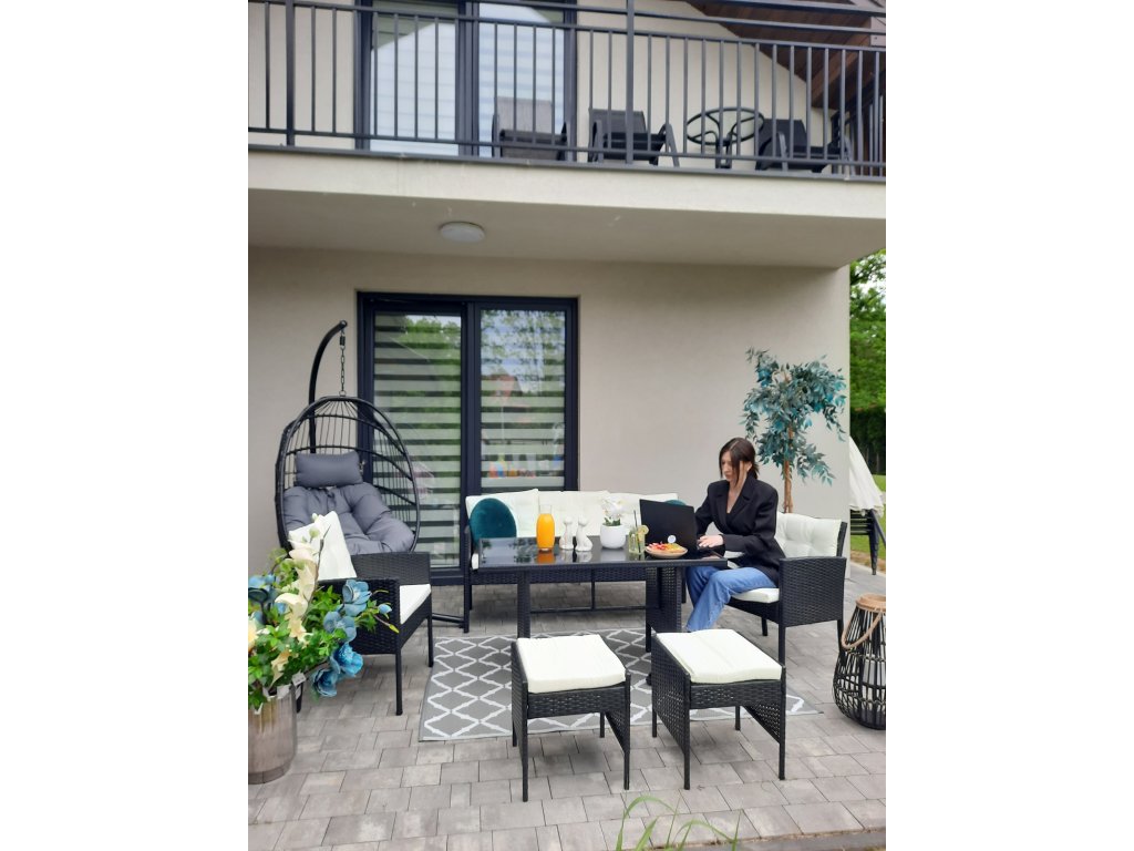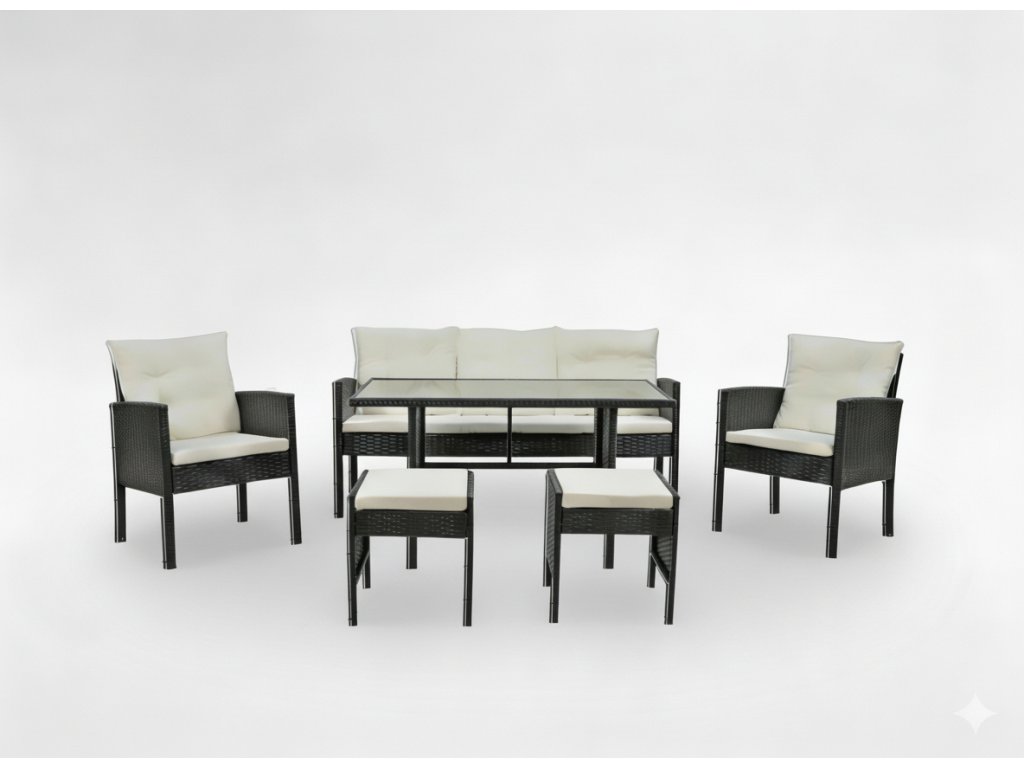 RATANOVÁ SÚPRAVA NÁBYTKU "VADUZ" (SOFA + 2 KRESLÁ + 2 TABURETKY + STÔL) ČIERNA + KRÉMOVÉ VANKÚŠE *9583