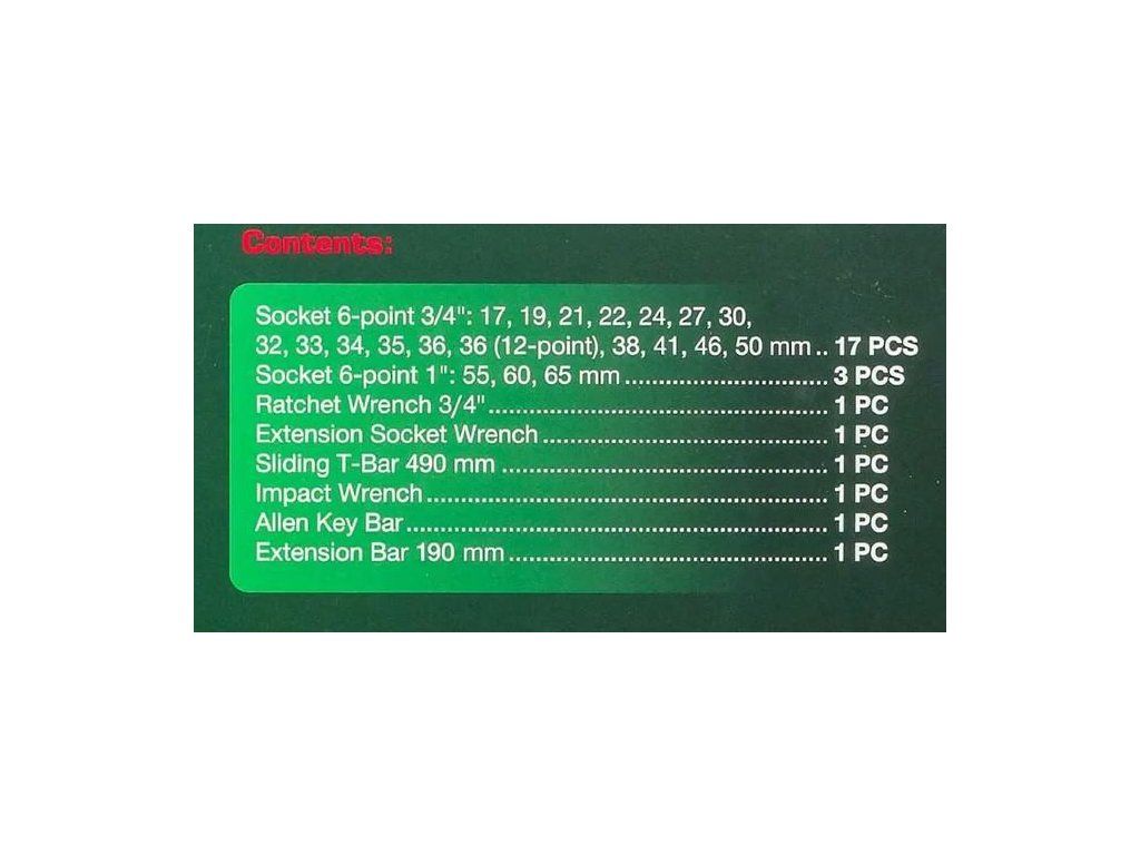- Šesťhranné nástrčky 3/4": 17 mm, 19 mm, 22 mm, 24 mm, 27 mm, 30 mm, 32 mm, 33 mm, 34 mm, 35 mm, 36 mm, 36 mm (12-hranné), 38 mm, 41 mm, 46 mm, 50 mm