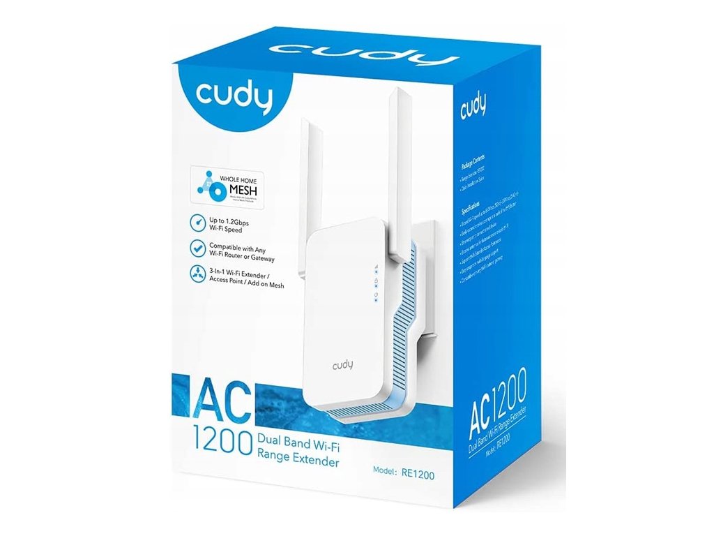 Sieťový extender RE1200 značky Cudy zosilňuje signál bezdrôtovej siete, umožňujúc tak jej rozšírenie. Spolupracuje s akýmkoľvek štandardným routerom alebo bránou. Ľahko rozšírite dosah bezdrôtovej siete jediným stlačením tlačidla WPS. Navyše zosilňovač obsahuje port Gigabit Ethernet na pripojenie káblových zariadení. Zariadenie je vybavené externými anténami pre rýchlejšie a spoľahlivejšie Wi-Fi. Cudy RE1200 je 2v1 - Wi-Fi zosilňovač a prístupový bod. Konfigurácia je veľmi jednoduchá vďaka asistentovi.