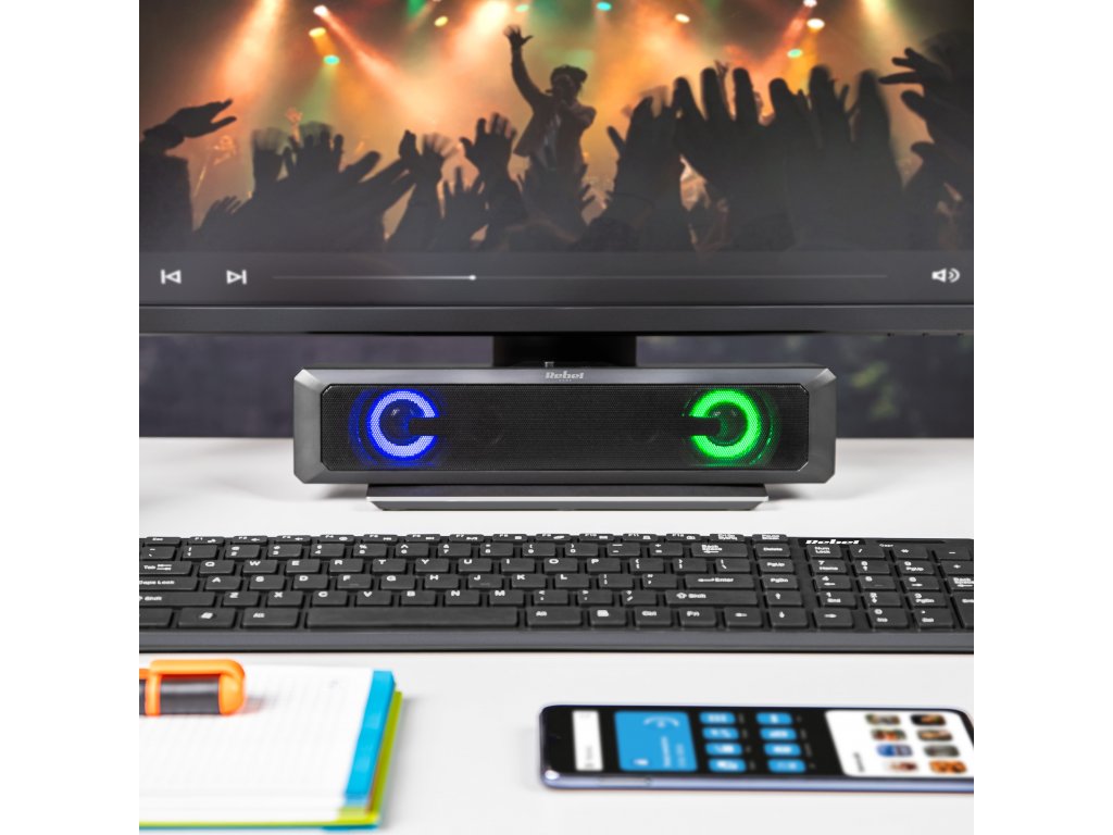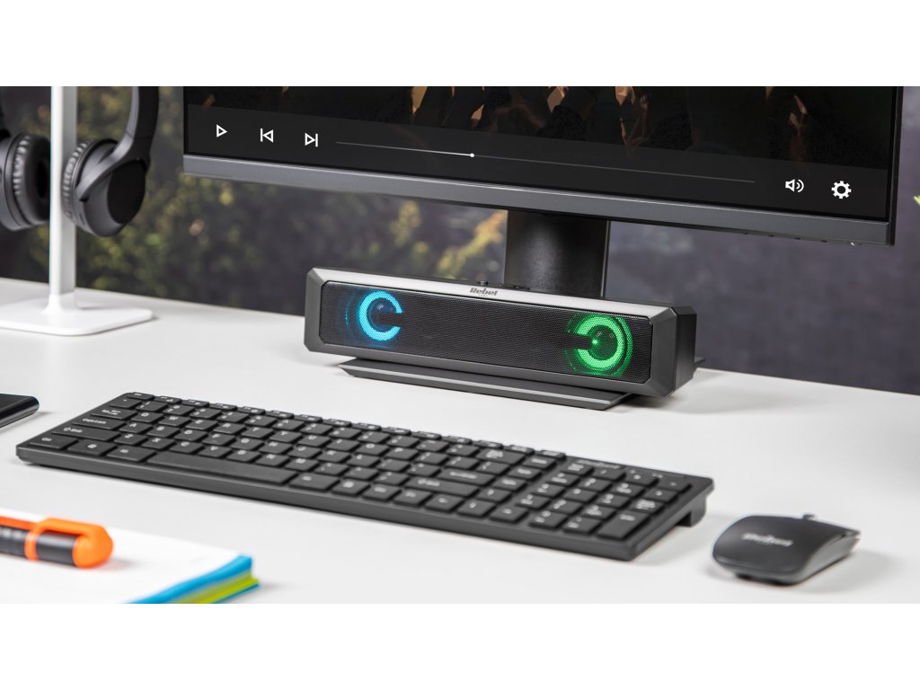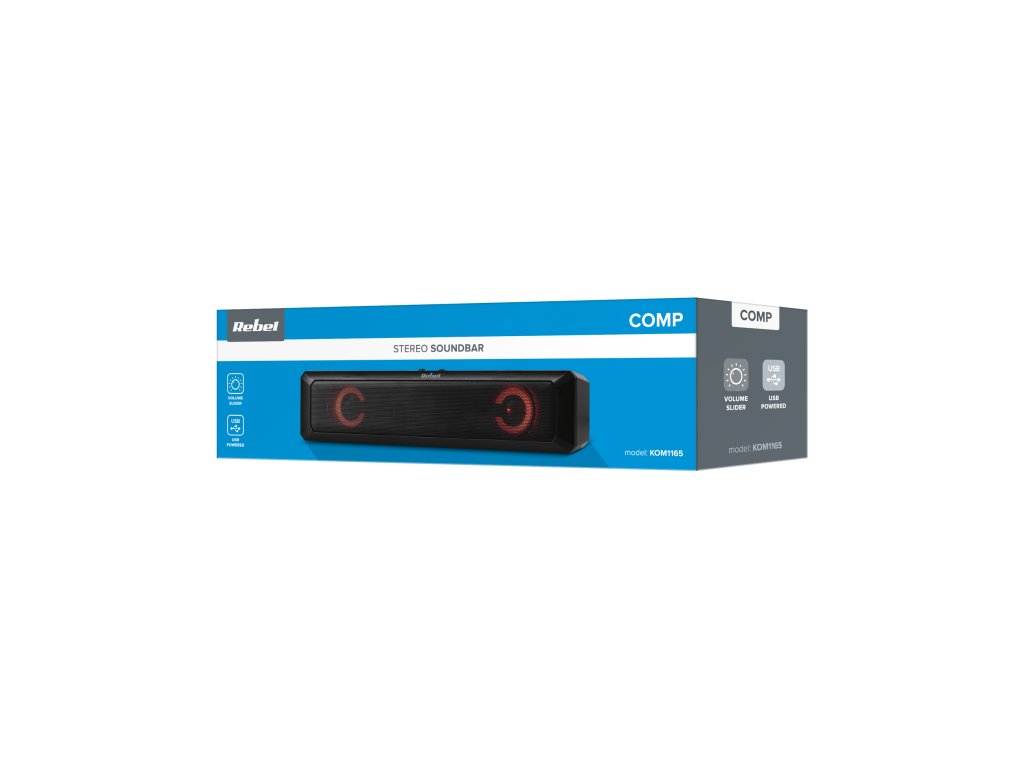 Kto hovorí, že počítačové zvukové zariadenie musí pozostávať aspoň z dvoch reproduktorov? Ak váš stôl nemá dostatok miesta, môžete si vybrať počítačový soundbar série Rebel Comp. Tento počítačový reproduktor je vybavený dvoma meničmi s výkonom 3 W, ktoré vám spríjemnia každodennú prácu s hudbou alebo sledovanie filmov.