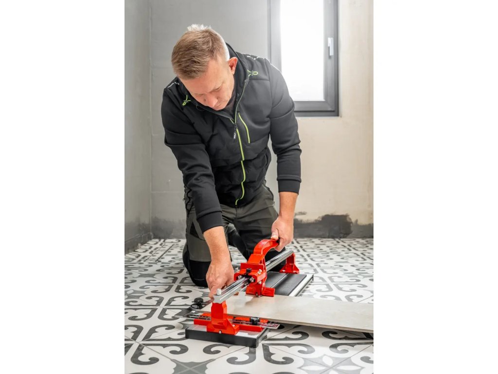 Je určený nas p r a co v an i e obkladov a terakoty. Stroj umožňuje vykonávať základné operácie rezania dlaždíc. Kombinovaný rezací nôžs ložiskom a účinný doraz sú uložené na jednom oceľovom vedení v tvare X. Stabilná základňa stroja je vyrobená z hliníka.Vlastnosti: