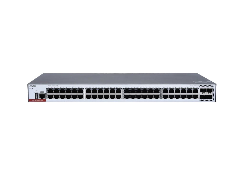Switch RG-CS83-48GT4XS značky Ruijie by Ruijie je pokročilý sieťový prepínač. Zariadenie má 48 portov RJ45 10/100/1000Mbps a 4 porty SFP+ 1G/10G. Výkonový rozpočet zariadenia je 40W. Tento model sa vyznačuje vysokou priepustnosťou na úrovni 176 Gbps. Prepínač umožňuje správu prenosových parametrov pomocou aplikácie Ruijie a WEB portálu.