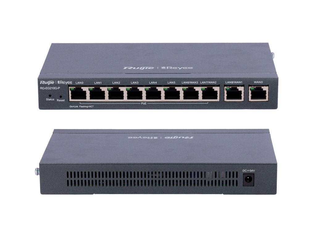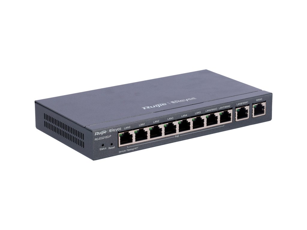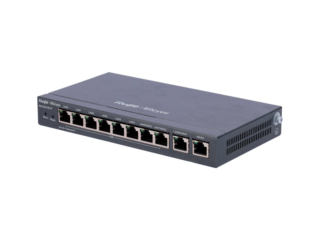 Spravovateľný router RG-EG210G-P značky Reyee sa dokonale osvedčí vo firme ako aj doma. Zariadenie má 8 LAN portov 10/100/1000Mbps Base-T s podporou technológie IEEE 802.3at / 802.af (power over ethernet), 1 WAN port 10/100/1000Mbps a 1 LAN/WAN port 10/100/1000Mbps