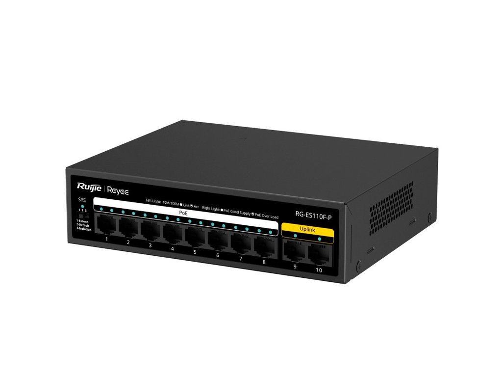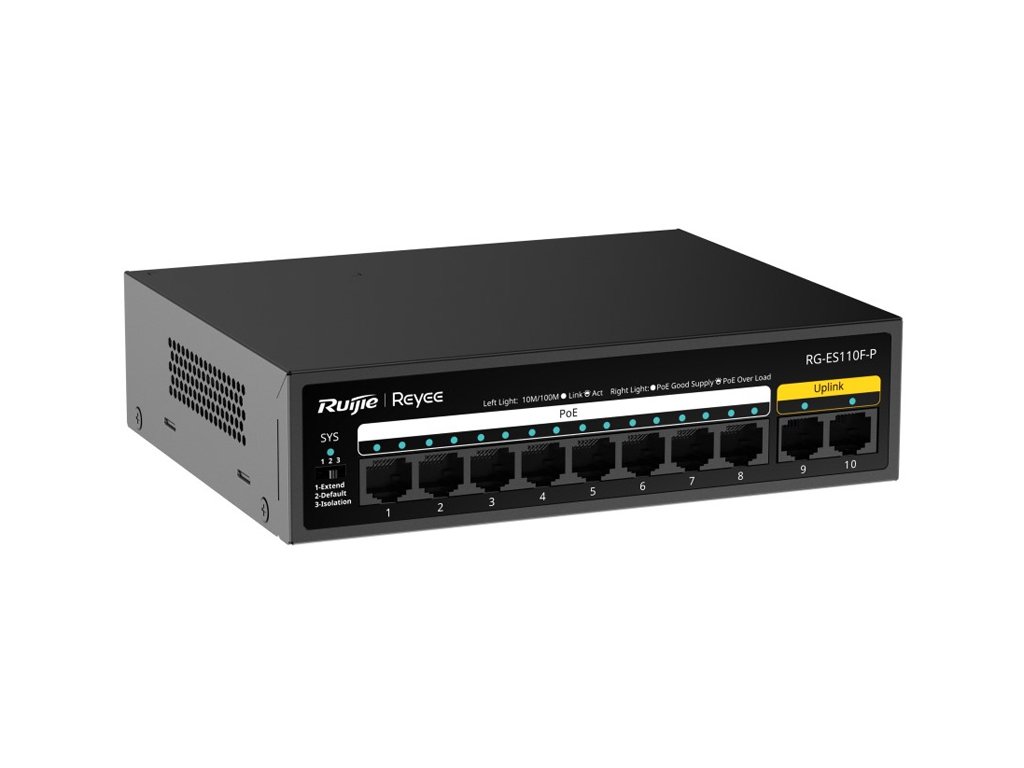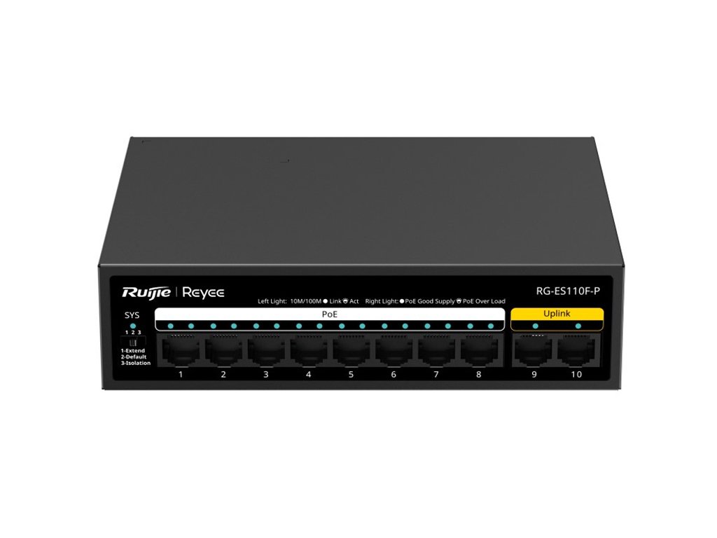 Switch RG-ES110F-P značky Reyee by Ruijie je pokročilý sieťový prepínač typu PoE. Zariadenie má 8 portov RJ45 10/100 Mb/s s podporou napájania PoE v štandarde IEEE 802.3at/802.af a 2 porty RJ45 10/100 Mb/s typu Uplink. PoE napájací rozpočet zariadenia je do 110W pre celý switch a do max. 30W na jeden port.