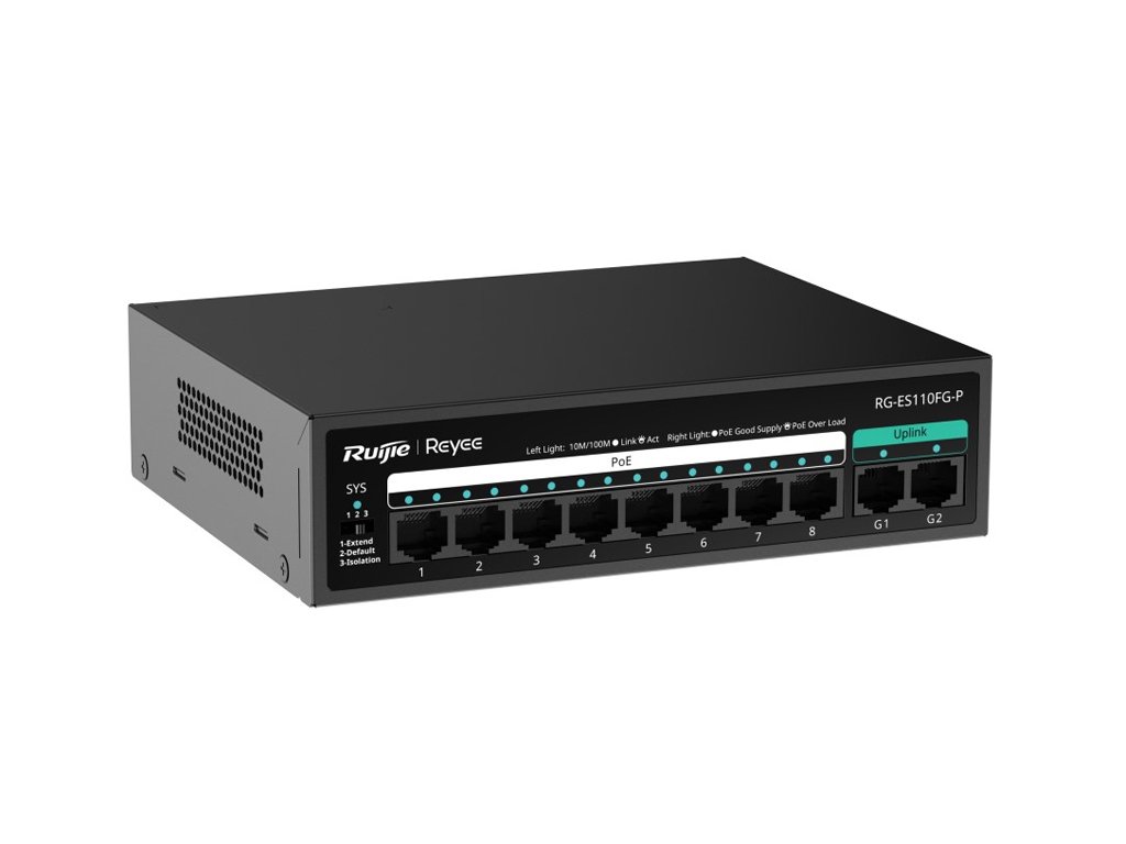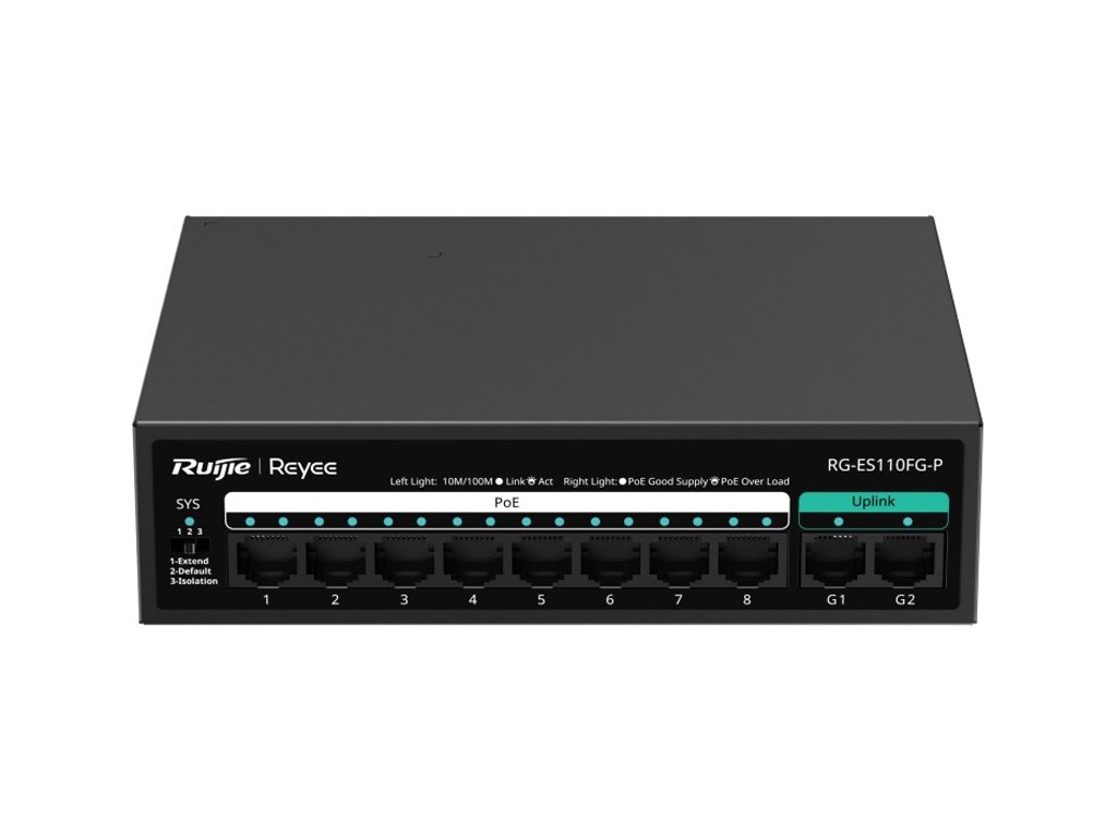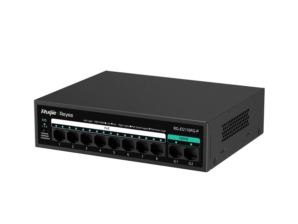 Switch RG-ES110FG-P značky Reyee by Ruijie je pokročilý sieťový prepínač typu PoE. Zariadenie má 8 portov RJ45 10/100 Mb/s s podporou napájania PoE podľa štandardu IEEE 802.3at/802.af a 2 porty RJ45 10/100/1000 Mb/s typu Uplink. PoE výkonový rozpočet zariadenia je do 110W pre celý prepínač a do max. 30W na jeden port.