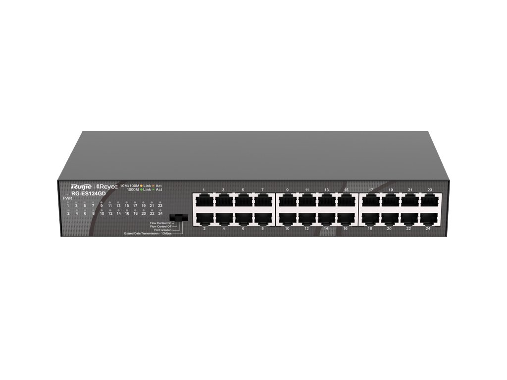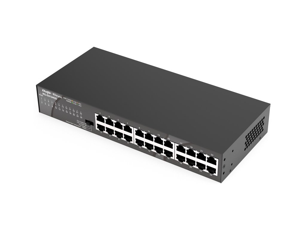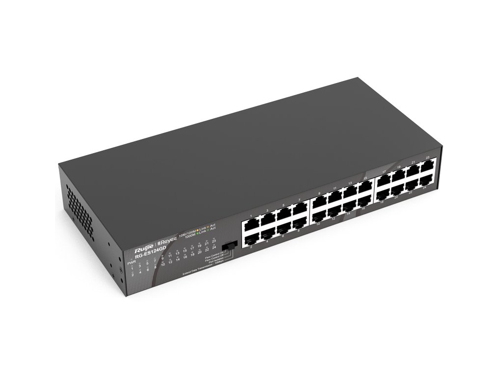 Prepínač RG-ES124GD značky Reyee od Ruijie je univerzálny sieťový prepínač s možnosťou monitorovania v Ruijie cloude. Zariadenie má 24 portov RJ45 s rýchlosťou 10/100/1000 Mbps. Prepínač je vybavený inteligentnými funkciami, ako sú Flow Control (C) a VLAN (izolácia portov).