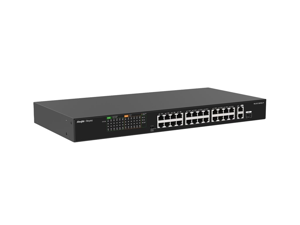 Sieťový prepínač RG-ES126FGS-P značky Reyee by Ruijie je pokročilý sieťový prepínač typu PoE. Zariadenie má 24 porty RJ45 10/100 Mb/s s podporou napájania PoE v štandarde IEEE 802.3at/802.af, 2 porty RJ45 10/100/1000 Mb/s typu Uplink s 1 portom Combo. Celková PoE kapacita zariadenia je do 370W pre celý prepínač a až max. 30W na jeden port.