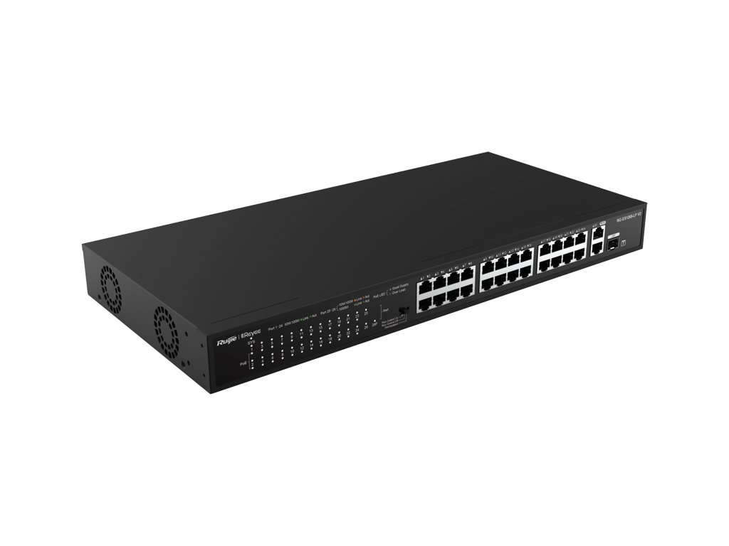 Switch RG-ES126S-P V2 značky Reyee by Ruijie je pokročilý sieťový prepínač typu PoE. Zariadenie má 24 portov RJ45 s podporou napájania PoE podľa štandardu IEEE 802.3at/802.af a 2 gigabitové RJ45 porty typu Uplink (vrátane 1x Combo). PoE rozpočet napájania zariadenia je do 370W pre celý prepínač a do maximálne 30W na jeden port.