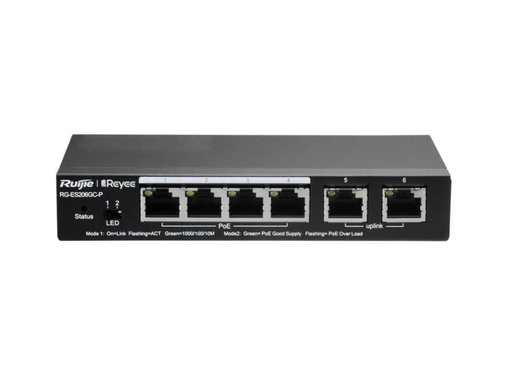 Switch RG-ES206GC-P značky Reyee by Ruijie je pokročilý sieťový prepínač typu PoE s možnosťou správy v Ruijie cloude. Zariadenie má 4 gigabitové RJ45 porty s podporou PoE napájania v štandarde IEEE 802.3at/802.af a 2 gigabitové RJ45 porty typu Uplink. PoE výkonový rozpočet zariadenia je do 54W pre celý switch a do max. 30W na jeden port. Switch umožňuje správu prenosových parametrov pomocou aplikácie Ruijie a webového portálu.