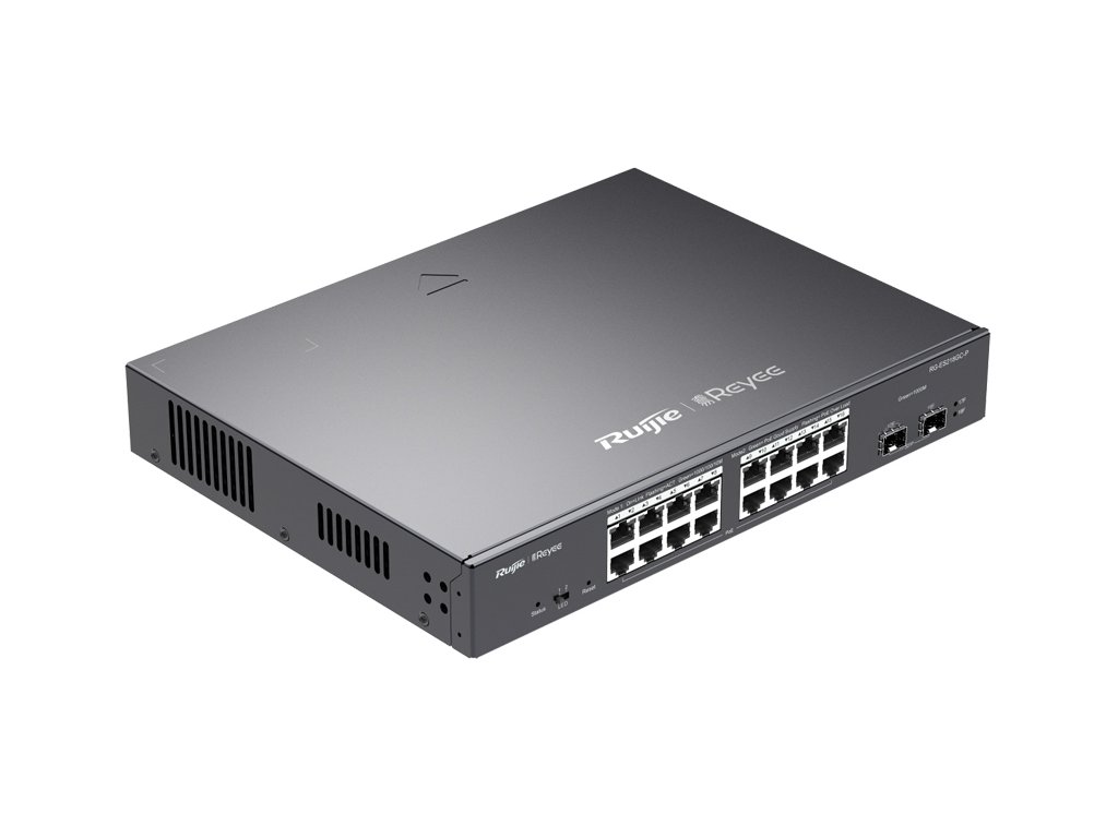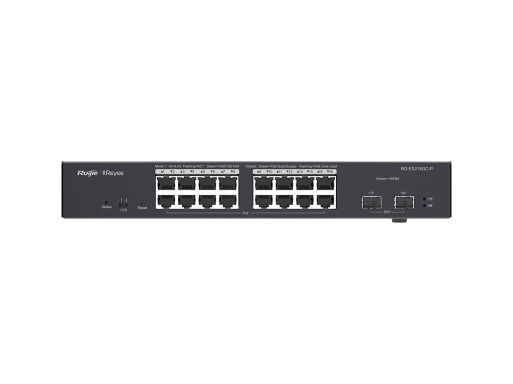 Switch RG-ES218GC-P značky Reyee by Ruijie je pokročilý sieťový prepínač typu PoE s možnosťou správy v cloudovom riešení Ruijie. Zariadenie má 16 gigabitových portov RJ45 s podporou PoE napájania v štandarde IEEE 802.3at/802.af a 2 gigabitové porty RJ45 typu SFP. PoE rozpočet zariadenia je do 240W pre celý switch a do max. 30W na jeden port. Switch umožňuje správu parametrov prenosu pomocou aplikácie Ruijie a webového portálu.