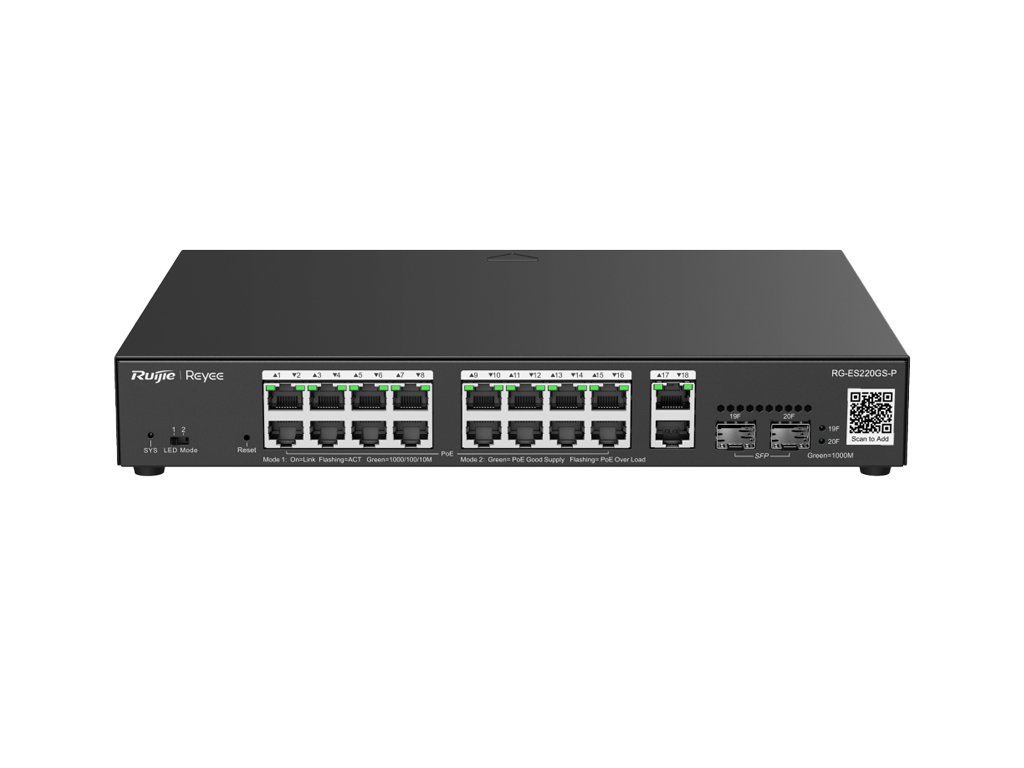 Prepínač RG-ES220GS-P značky Reyee by Ruijie je pokročilý sieťový prepínač typu PoE s možnosťou riadenia v cloude Ruijie. Zariadenie disponuje 16 gigabitovými portmi RJ45 s podporou napájania PoE v štandarde IEEE 802.3at/802.af, 2 gigabitové porty typu Uplink a tiež 2 gigabitové porty RJ45 typu SFP. PoE rozpočet napájania zariadenia je do 250W pre celý prepínač a do max. 30W na jeden port. Prepínač umožňuje riadenie prenosových parametrov prostredníctvom aplikácie Ruijie a webového portálu.