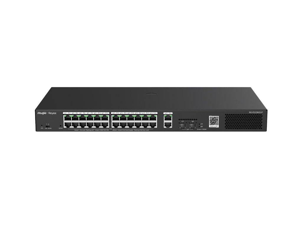 Switch RG-ES228GS-P značky Reyee by Ruijie je pokročilý sieťový switch typu PoE s možnosťou správy v cloudovom prostredí Ruijie. Zariadenie má 24 gigabitových portov RJ45 s podporou napájania PoE štandardu IEEE 802.3at/802.af, 2 gigabitové uplink porty a 2 gigabitové RJ45 porty typu SFP. Napájací rozpočet PoE zariadenia je do 370W pre celý switch a do max. 30W na jeden port. Switch umožňuje správu parametrov prenosu pomocou aplikácie Ruijie a WEB portálu.