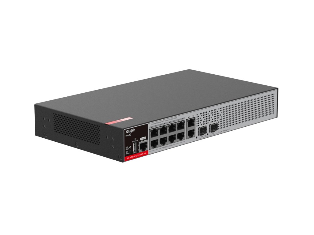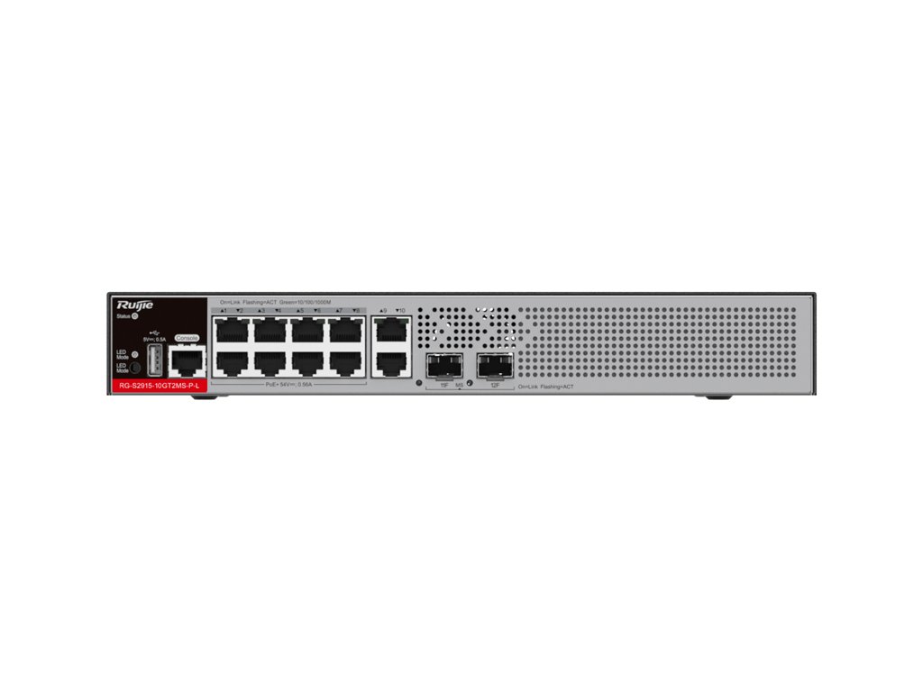 Switch RG-S2915-10GT2MS-P-L značky Ruijie je pokročilý sieťový prepínač typu PoE. Zariadenie má 10 portov RJ45 10/100/1000Mbps vrátane 8 s podporou technológie PoE napájania v štandarde IEEE 802.3at / 802.3af a 2 porty SFP 2G/1G. PoE napájací rozpočet zariadenia je 125W pre celý switch a do 30W pre jeden port. Model sa vyznačuje vysokou priepustnosťou na úrovni 30 Gbps. Switch umožňuje správu parametrov prenosu pomocou aplikácie Ruijie a portálu WEB.