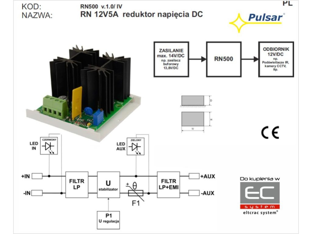 Redukcia napätia RN 12V/5A (RN 500) spoločnosti Pulsar slúži na zníženie a stabilizáciu jednosmerného napätia v rozmedzí 12÷14V na hodnotu 12V (nastavenie 11V÷Uin DC). V prípade, že vstupné napätie klesne pod hraničnú hodnotu nastaveného výstupného napätia, dôjde k úplnému otvoreniu tranzistora a redukcia vedie bezobstratovo (pokles napätia ?U<1%). To umožňuje plné využitie energie uloženej v akumulátore napájacieho zdroja pri batériovej prevádzke. Redukcia RN500 v spojení s typickým záložným napájacím zdrojom je určená na napájanie zariadení vyžadujúcich stabilizované napätie 10V÷12V DC. Obzvlášť je určená pre systémy priemyselnej televízie CCTV (kamery, IR osvetlenie), kontrolu prístupu KD a iné, v ktorých sú zariadenia napájané napätím 12V DC (-10%/+5%) a nemôžu byť napájané priamo z výstupu 13,8V DC záložného zdroja.