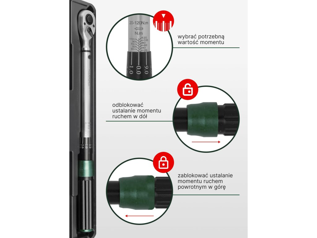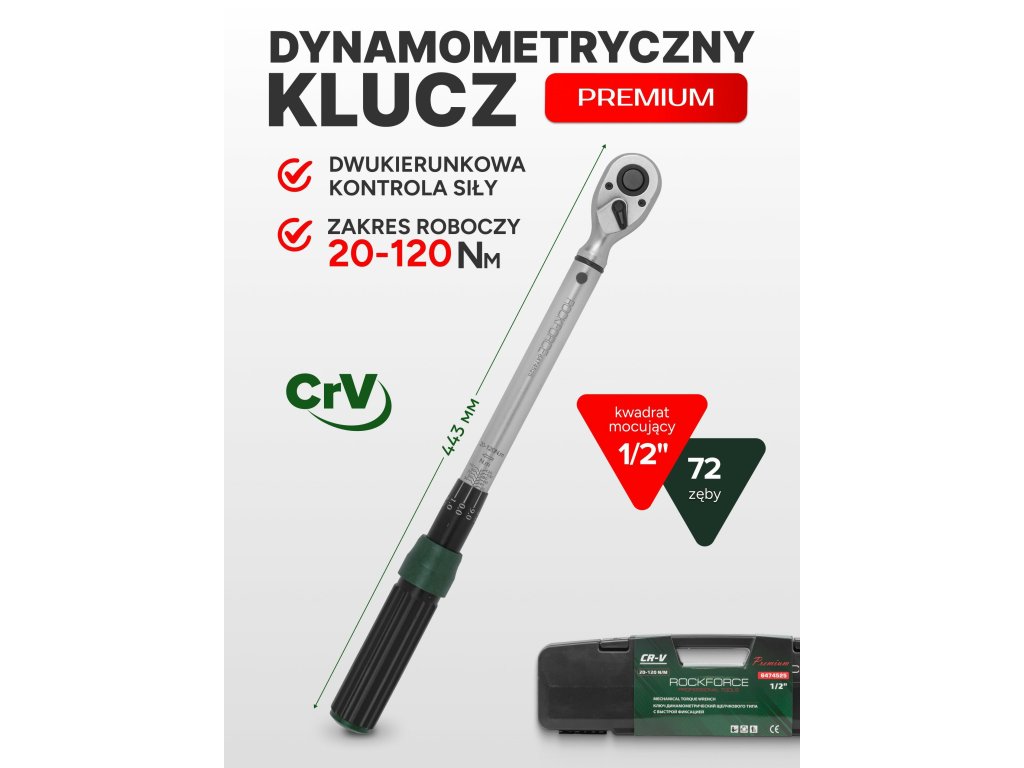 Profesionálny momentový kľúč ROCKFORCE Premium 1/2" je nástrojom vytvoreným s ohľadom na presné uťahovanie skrutiek a matíc so stanoveným krútiacim momentom. Vďaka rozsahu 20–120 Nm, pevnej konštrukcii z chróm-vanádiovej ocele CR-V a presnému račňovému mechanizmu (72 zubov), kľúč zaručuje presnosť, bezpečnosť a pohodlie práce v každých podmienkach.