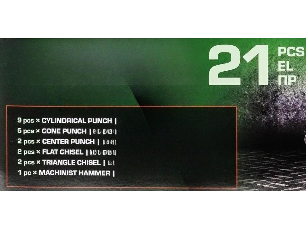 Kompletná sada 21 prvkov – dláta, úderníky, vyrážače, razidlá a kladivo pre širokú škálu zámočníckych, montážnych a opravných prác.