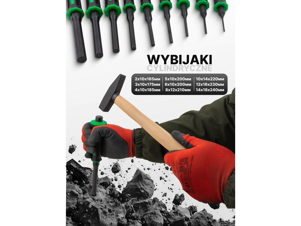 - Cylindrické vyrážače – 9 ks: 2×10×165 mm, 3×10×175 mm, 4×10×185 mm, 5×10×200 mm, 6×10×200 mm, 8×12×210 mm, 10×14×220 mm, 12×16×230 mm, 14×18×240 mm