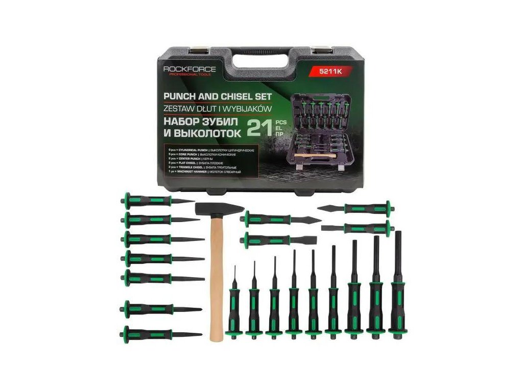 RockFORCE RF-5211K je kompletná sada profesionálnych dlát, vyrážačov, úderníkov a razidiel, navrhnutá s ohľadom na presné zámočnícke, montážne a opravné práce. Táto bohatá sada s 21 prvkami sa osvedčí ako v profesionálnych dielňach, tak v domácich aplikáciách, ponúkajúc širokú škálu možností – od hrubej úpravy kovov po jemné, presné práce vyžadujúce najvyššiu presnosť.