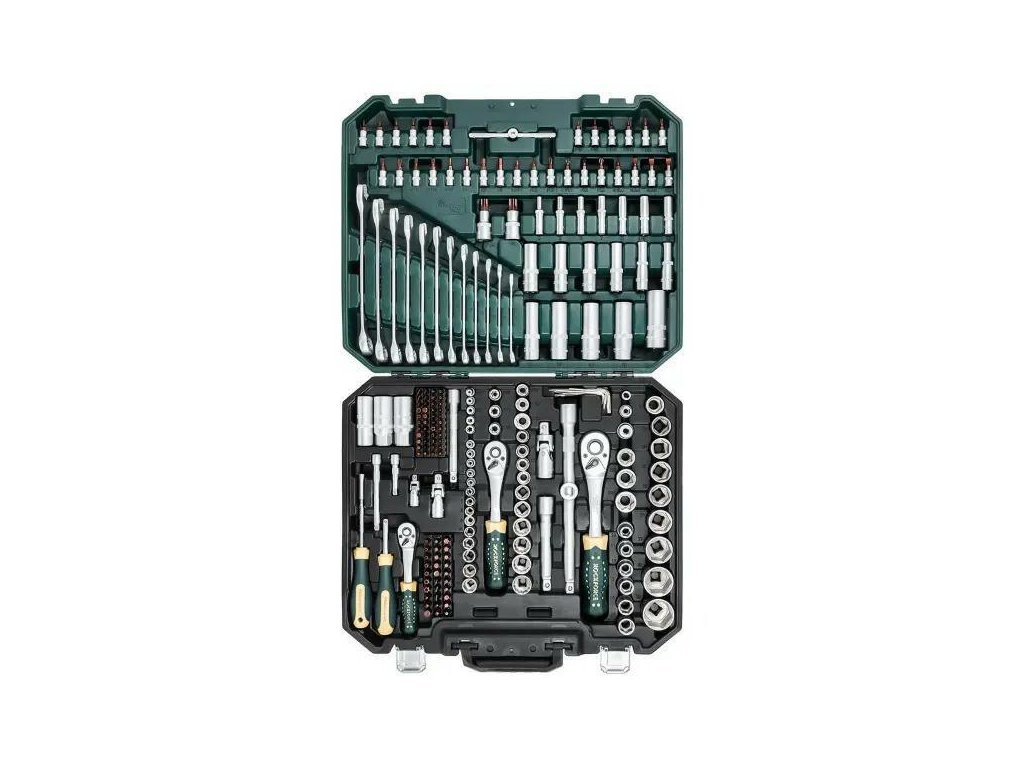 Sada náradia je zabalená v pevnom, odolnom kufríku z umelej hmoty, vybavenom kovovými zámkami a praktickým držadlom. Vďaka tomu je sada ľahko prenosná a odolná proti poškodeniu, dokonca aj v náročných podmienkach – na stavbe, v dielni alebo v teréne.