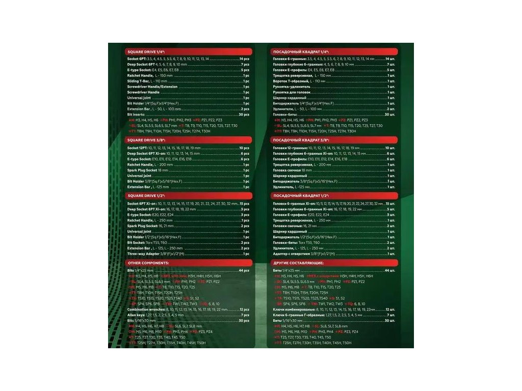 - 1/4” (44 kusov): H (šesťhranné): 3, 4, 5, 6 HH (šesťhranné dlhé): 3, 4, 5, 6 SL (ploché): 4, 5.5, 6.5 M (spline): 5, 6, 8 T (Torx): 8, 10, 15, 20, 25 SP (spanner): 4, 6, 8 TH (Torx s otvorom): 8, 10, 15, 20, 25 PH (krížové): 1, 2 TS (Torq-set): 10, 15, 20, 25, 40 PZ (Pozidriv): 1, 2 TW (Tri-wing): 1, 2, 3 TQ (Torq): 6, 8, 10 S (štvorcové): 1, 2