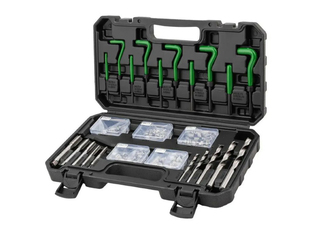 Profesionálna sada na obnovu a opravu poškodených závitov M5–M12 – až 131 prvkov v pevnej dielenskej prenoske. Set obsahuje všetko potrebné na efektívne obnovenie poškodených, opotrebovaných alebo korodovaných vnútorných závitov: závitníky, špirálové vložky, vrtáky, montážne nástroje a vyťahováky. Nenahraditeľné riešenie v každej automobilovej dielni, mechanickom servise, zámočníckej dielni, ako aj v priemyselných a opravárenských aplikáciách.