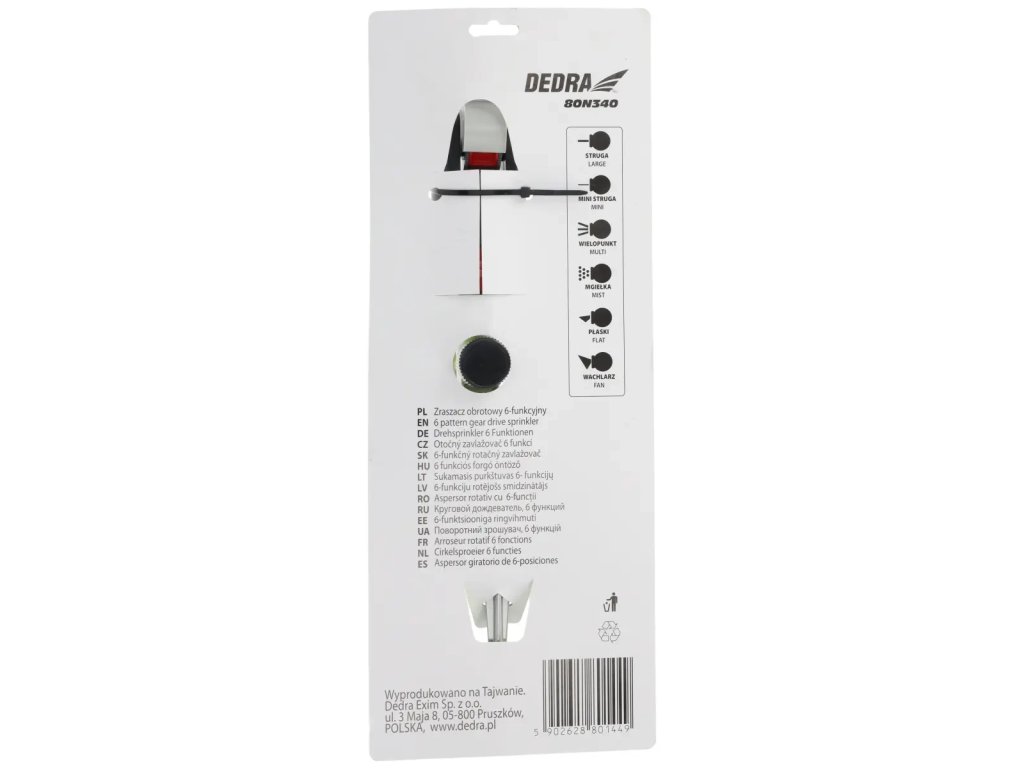Použitá hlavica trysky umožňuje regulovať uhol striekania pre maximálne pokrytie a výber 1 zo 6 tvarov plášťa. Záhradný postrekovač DEDRA 80N340 má rad preddefinovaných vodných rozprašovačov: prúdový, miniprúdový, viacbodový, plochý, hmlový a jemný. Integrované pripojenie umožňuje integrovať zavlažovač do väčších zavlažovacích systémov sériovým zapojením jednotlivých prvkov, čím sa maximálna plocha postreku zvýši na 490 m2.