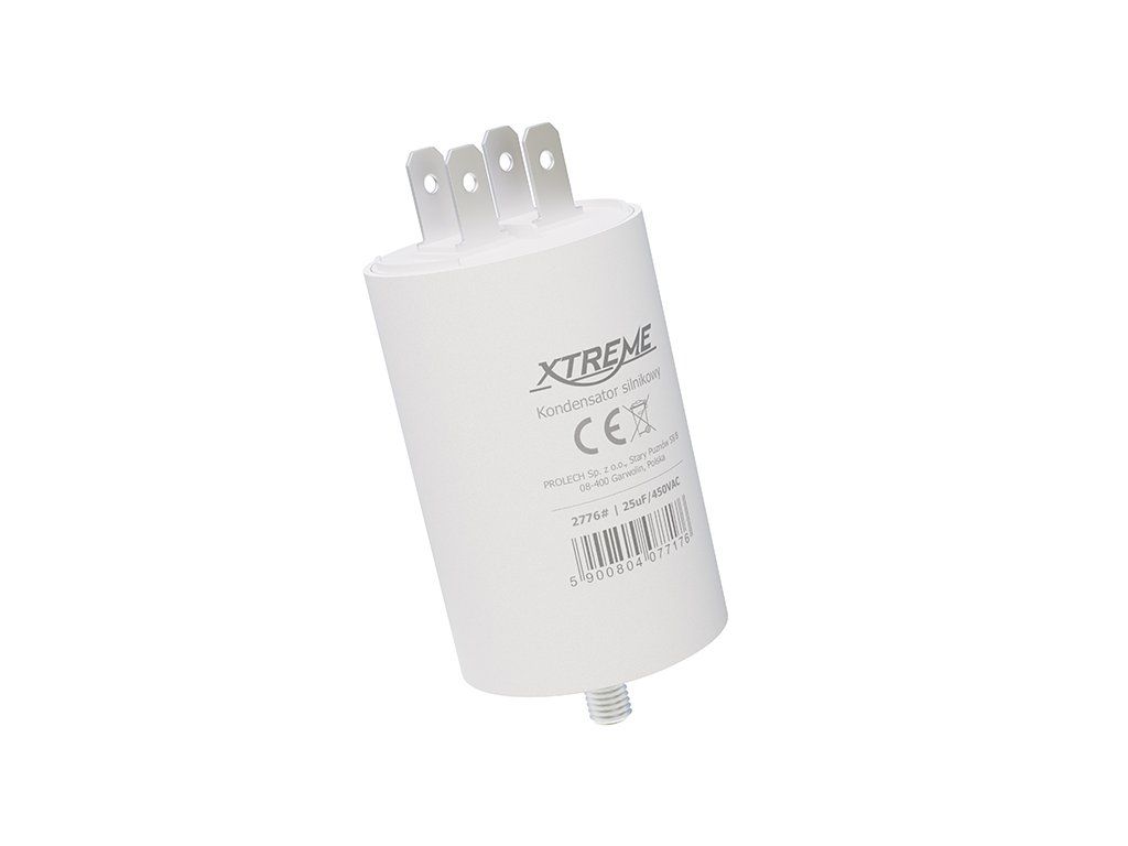 Rozbehový kondenzátor 25uF/450V je určený pre jednofázové striedavé indukčné motory s frekvenciou 50/60 Hz. Používa sa ako štartovací a pomocný prvok pri rozbehu motora, kde pomáha vytvoriť potrebný fázový posun a zabezpečiť spoľahlivé naštartovanie zariadenia.