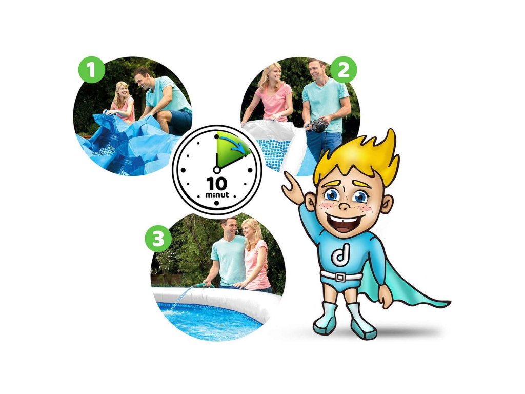 Nafukovací bazén je banálne jednoduchý na montáž a pripravený na použitie v niekoľkých chvíľach.