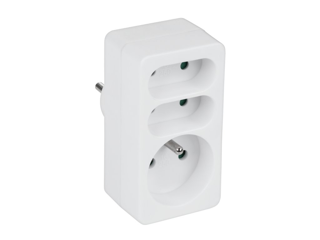 Dzięki trzem gniazdom (dwóm płaskim i jednemu okrągłemu), rozgałęziacz pozwala na elastyczne podłączenie różnorodnych urządzeń elektrycznych. To praktyczne rozwiązanie, które eliminuje konieczność posiadania wielu przedłużaczy czy gniazdek, ułatwiając zarządzanie zasilaniem w pomieszczeniu.