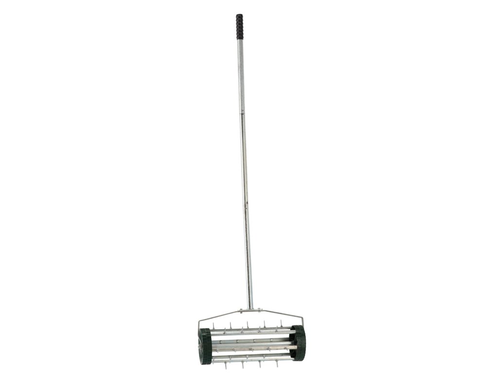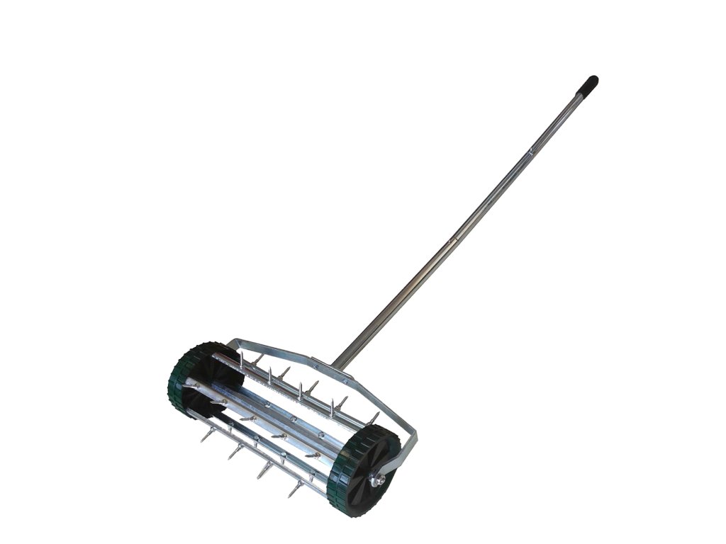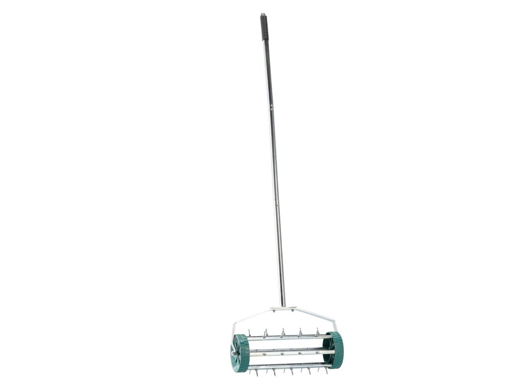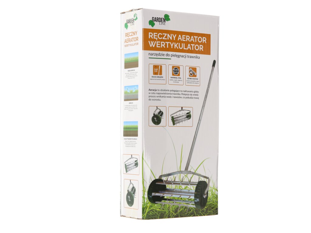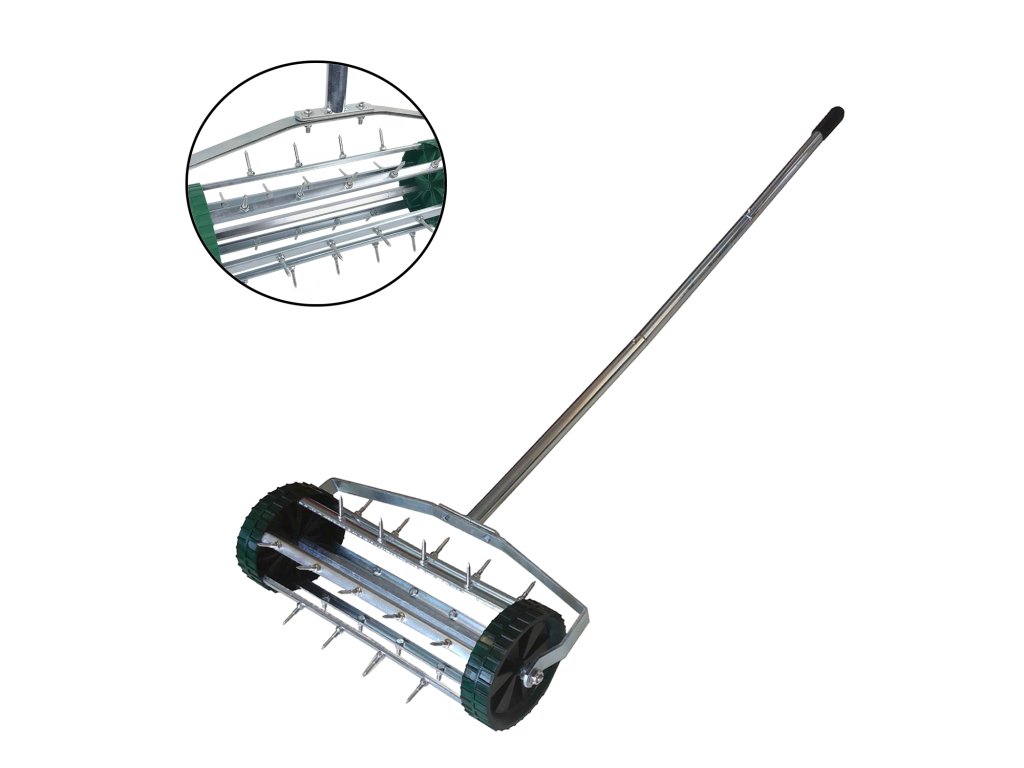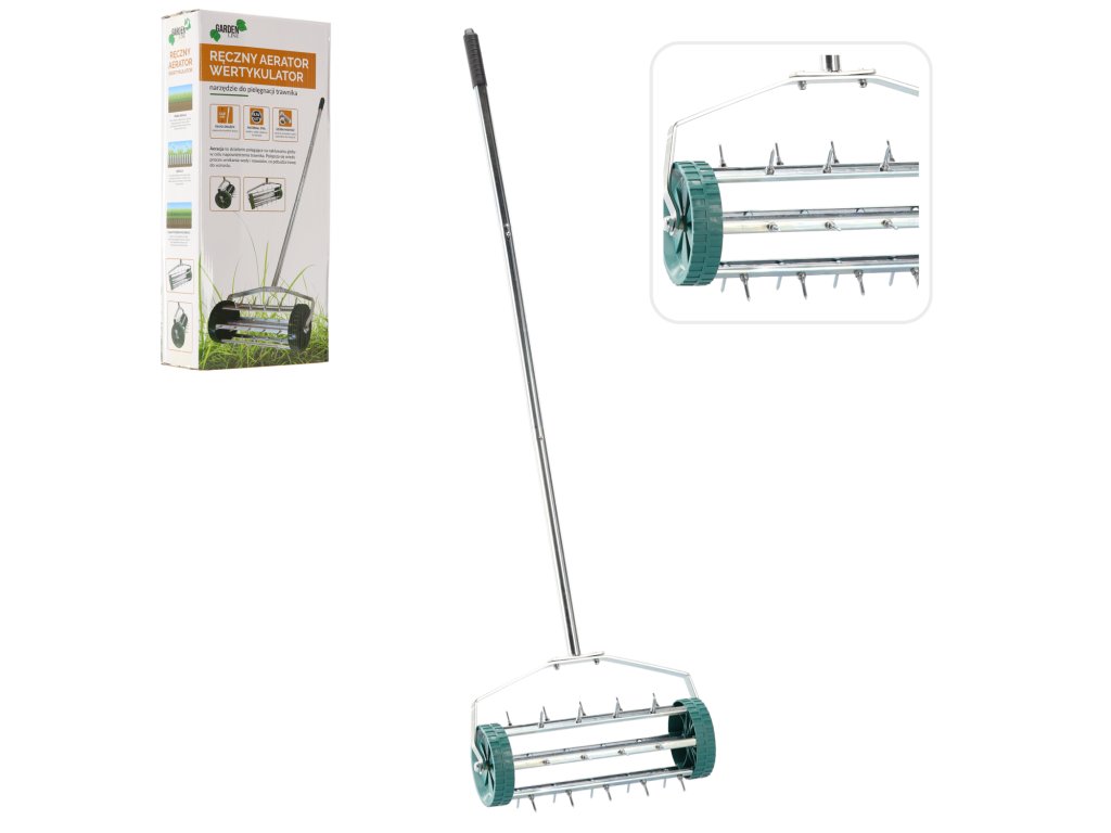 Ručný aerátor s kolieskami, slúžiaci na prevzdušňovanie trávnika prostredníctvom prepichovania pôdy hrotmi. Je to nevyhnutné zariadenie na údržbu okrasných trávnikov, ktoré umožňuje prerezávanie machu a zlepšuje kondíciu trávy. Vďaka kolieskam je práca s aerátorom komfortná a efektívna. Odporúča sa vykonávať aeráciu trávnika dvakrát za sezónu, čo umožňuje uvoľnenie a prevzdušnenie pôdy.