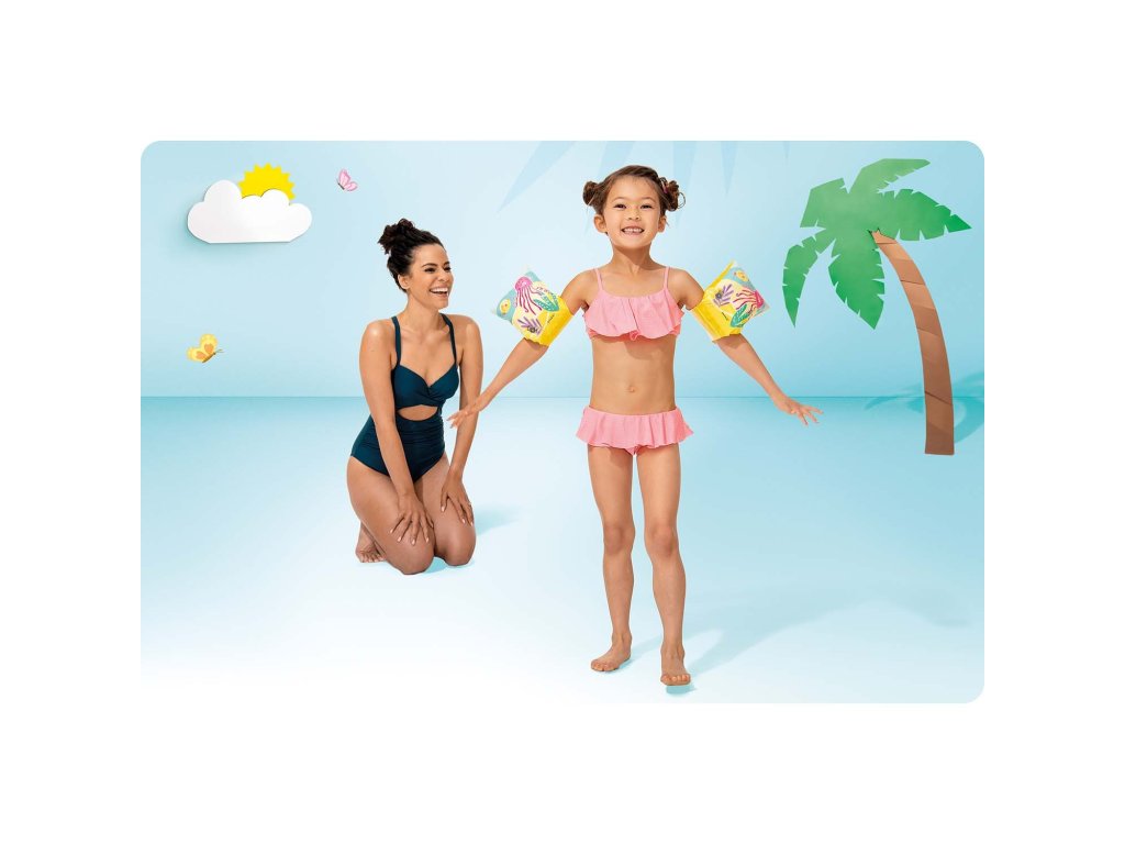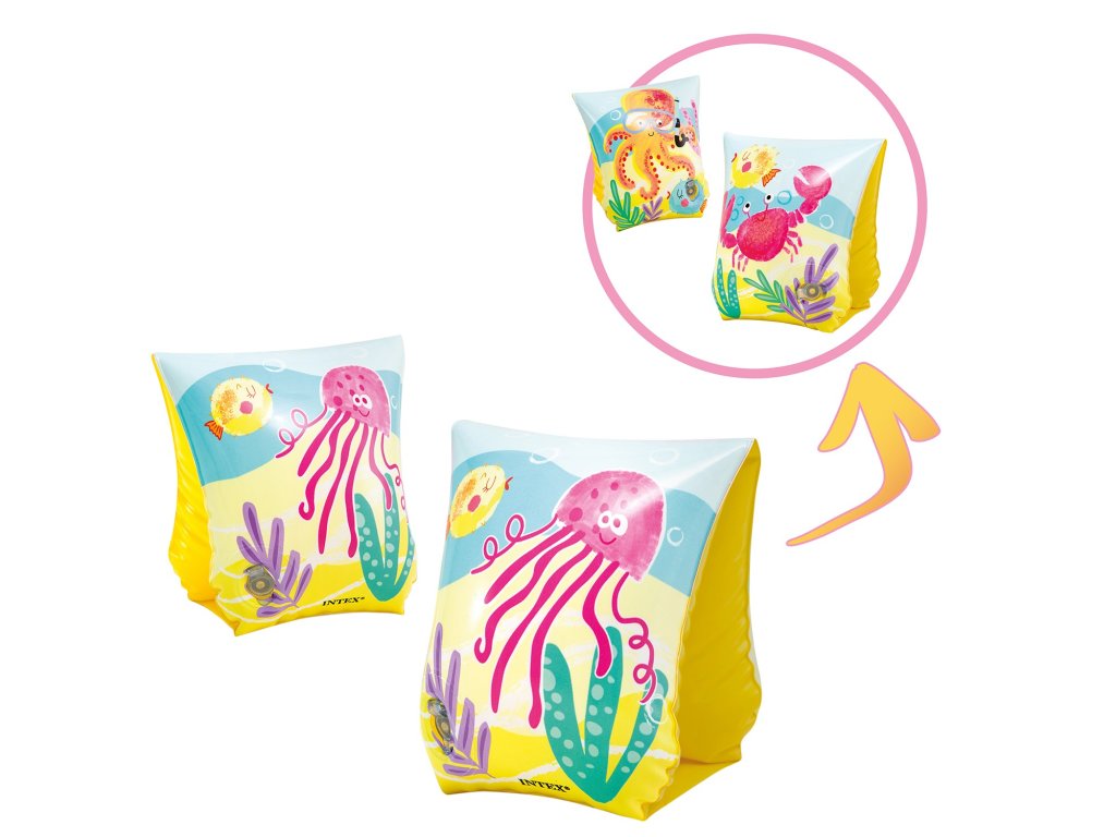Farebné rukávky spôsobia, že vaše dieťa bude vynikať na pláži. Na jednej strane majú rukávky farebnú grafiku medúzy, na druhej strane kraba a chobotnicu.