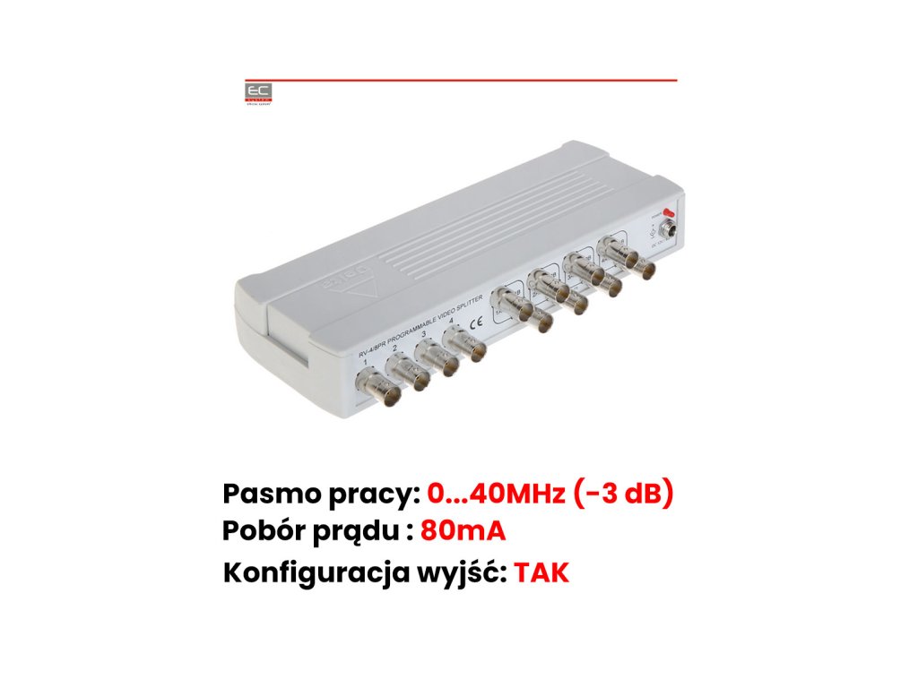 RV-4/8PR je video rozbočovač, ktorý umožňuje rozdelenie video signálov. Zariadenie je prispôsobené na nepretržitú prevádzku v uzavretých priestoroch. Produkt je tiež prispôsobený pre farebné kamery, čiernobiele a PAL. Vhodné vzdialenosti medzi zásuvkami zabezpečujú možnosť voľného dotiahnutia BNC konektorov prstami. RV-4/8PR je predvolene nastavený ako 4 nezávislé video rozbočovače 1/2. Výhodou tohto rozbočovača je jednoduchá konfigurácia pomocou prepojok, ktoré sú dostupné po odstránení krytu. Zvislé prepojky aktivujú jednotlivé vstupy, zatiaľ čo vodorovné prepojky spájajú výstupy. Je veľmi ľahké ho preprogramovať pomocou prepojok nachádzajúcich sa na prednom paneli.