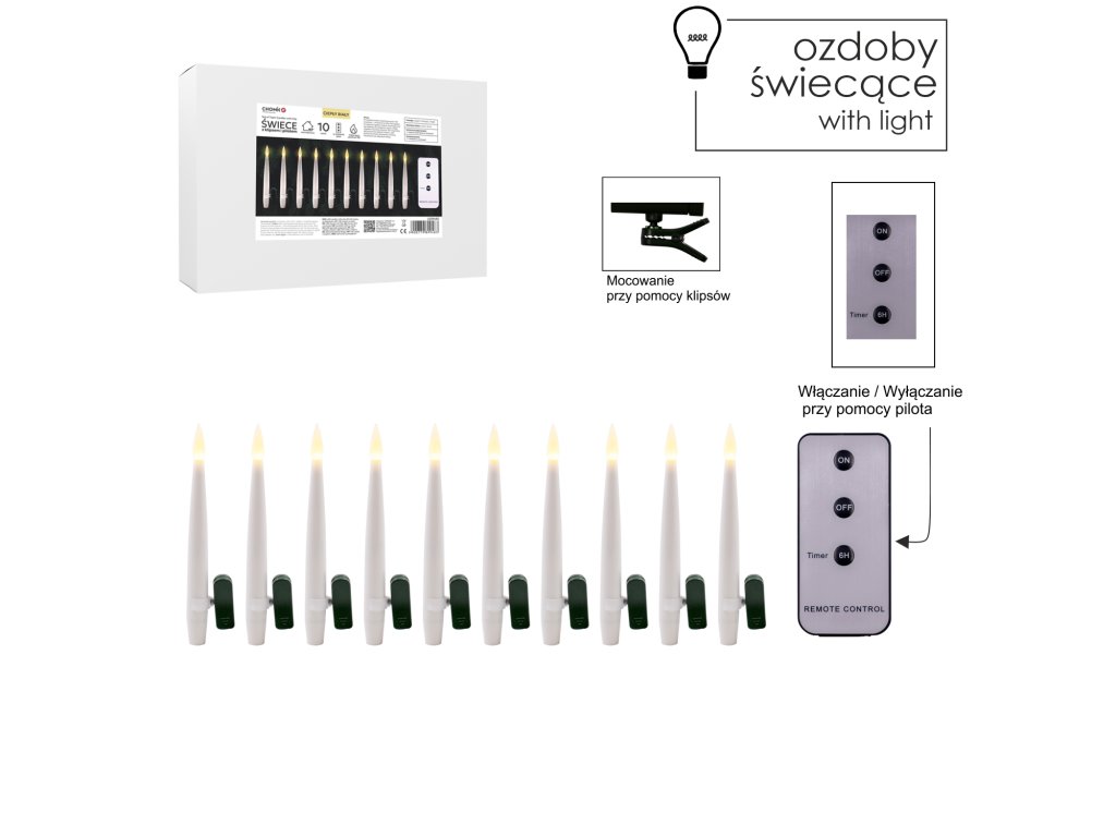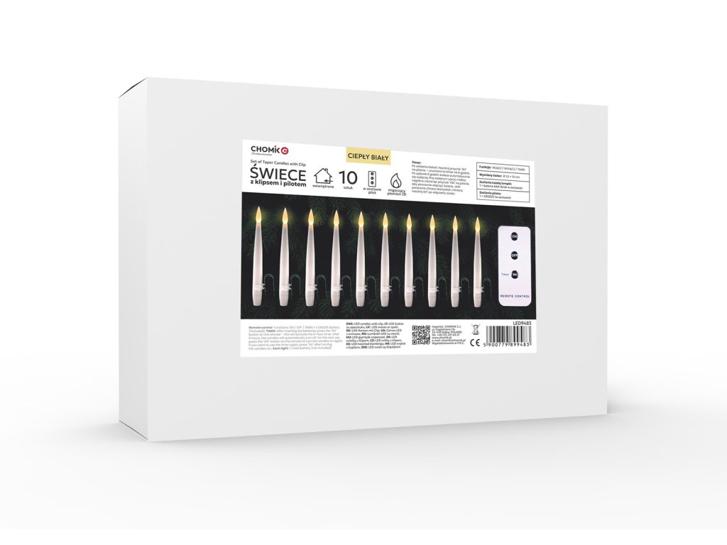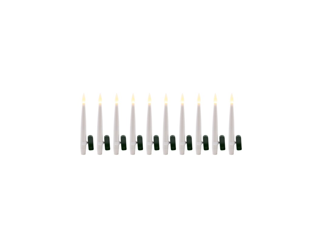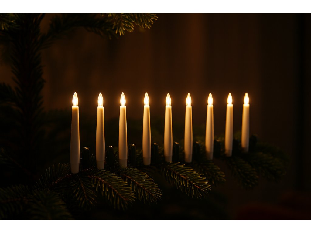 Súprava 10 kužeľových LED sviečok s klipmi, ktoré je možné pohodlne pripevniť na vianočný stromček, veniec, aranžmán alebo iné sviatočné dekorácie. Každá sviečka vydáva teplé, mihotavé svetlo imitujúce prirodzený plameň, vytvárajúc útulnú a elegantnú atmosféru. Vďaka napájaniu na batérie AAA sú úplne bezpečné a mobilné, a diaľkový ovládač s funkciami zapínania, vypínania a časovača zabezpečuje pohodlie používania. Je to praktická a efektná alternatíva k tradičným sviečkám.