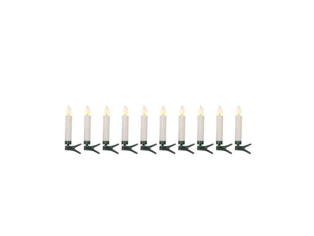 Sada 10 LED sviečok s klipmi, ktoré je možné ľahko pripevniť napríklad na vianočný stromček, veniec alebo vianočnú dekoráciu. Každá sviečka je vybavená realistickým 3D plameňom v teplej bielej farbe s efektom blikania, čo vytvára útulnú a bezpečnú atmosféru. Pohodlné ovládanie zabezpečuje diaľkový ovládač s funkciami zapnutia, vypnutia a časovača. Sviečky sú napájané batériou AAA (nie je súčasťou balenia) a ovládač funguje na batériu CR2025. Je to elegantná a praktická vianočná dekorácia bez rizika ohňa a dymu.