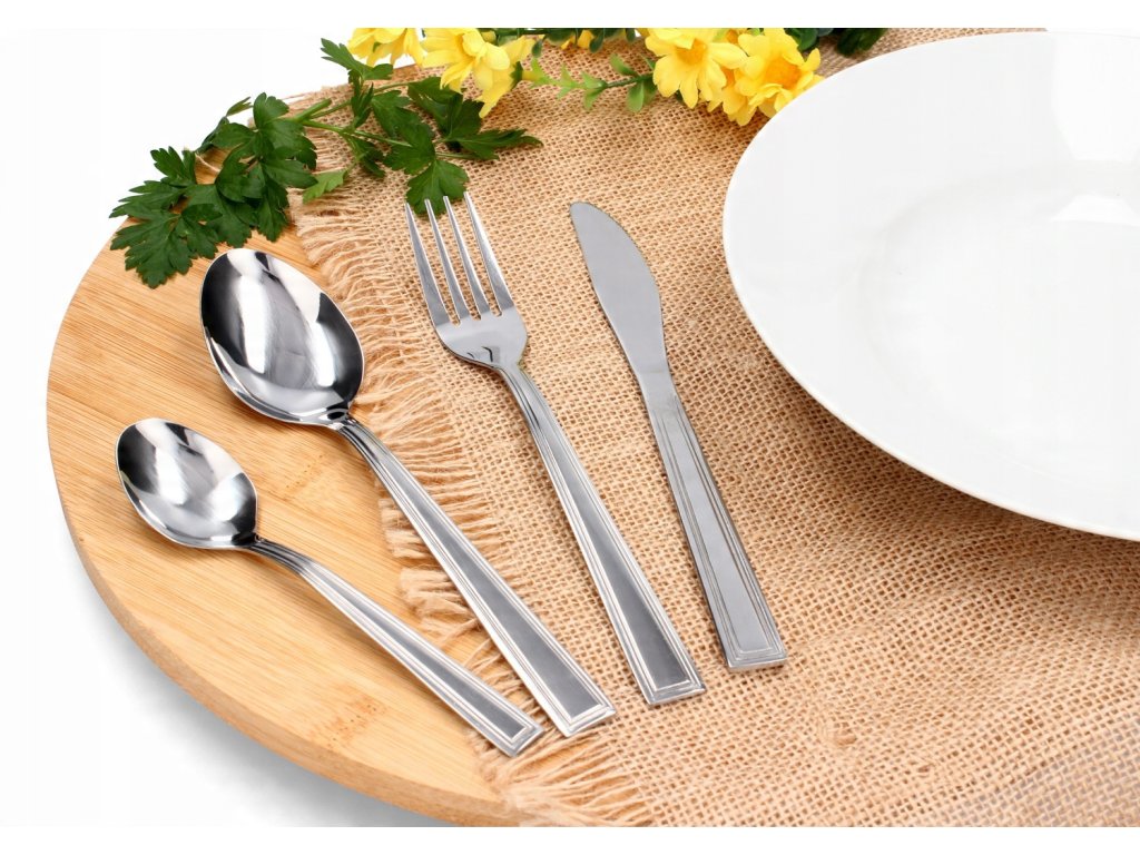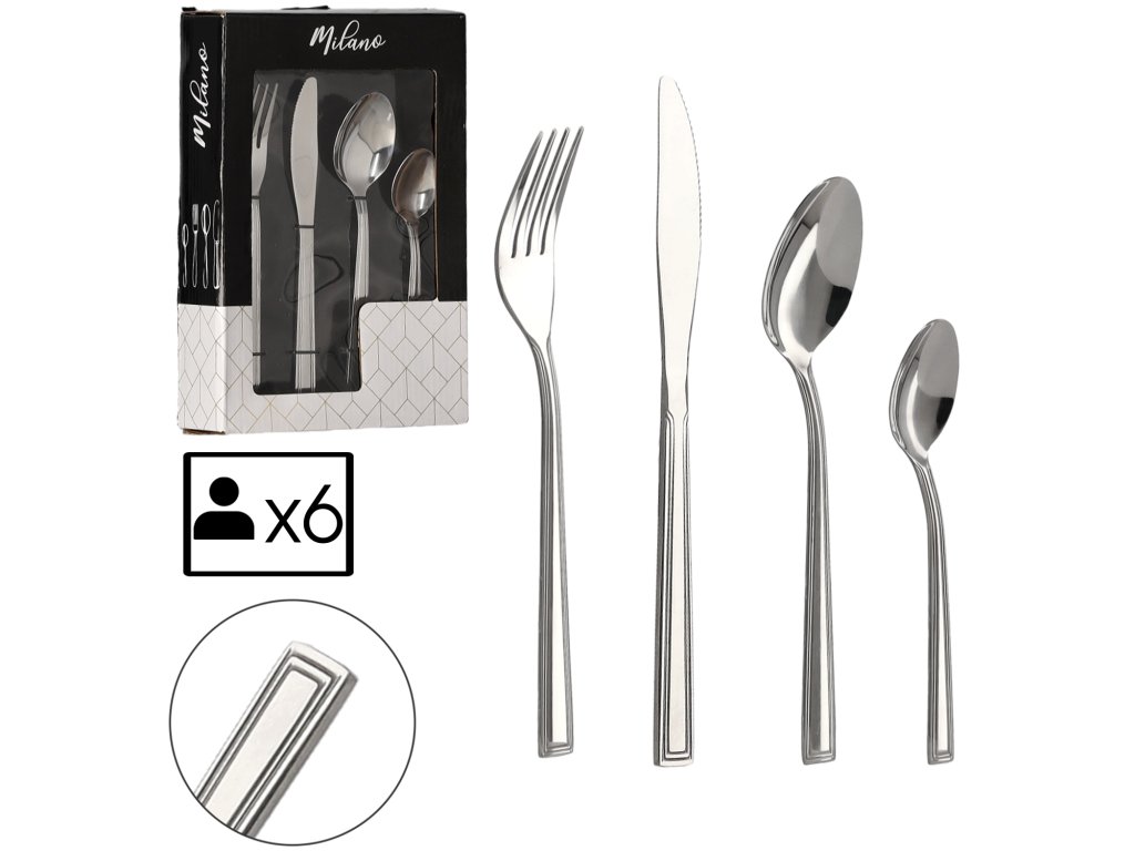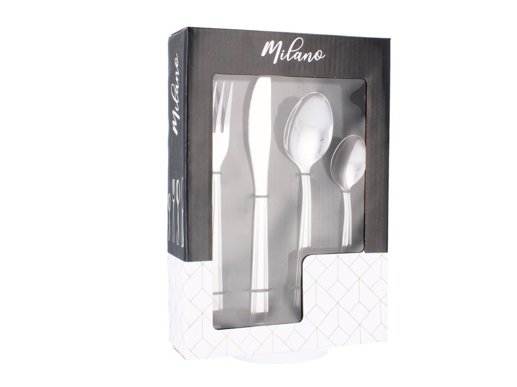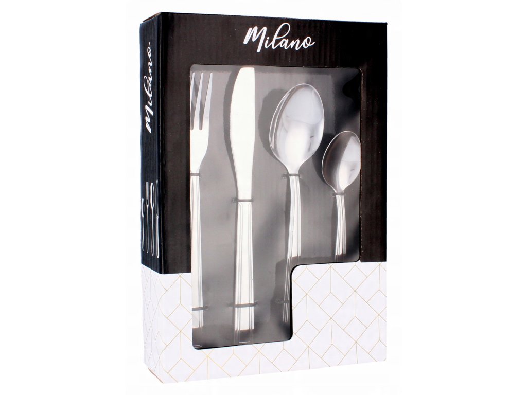 Príbor „Milano” - súprava 24 kusov. Súprava obsahuje 6 nožov, vidličiek, stolových lyžíc a čajových lyžičiek. Príbor sa vyznačuje klasickým dizajnom. Jednoduchosť a elegancia sa tu spájajú s veľmi dobrou kvalitou a solídnym spracovaním.Dodatočné parametre