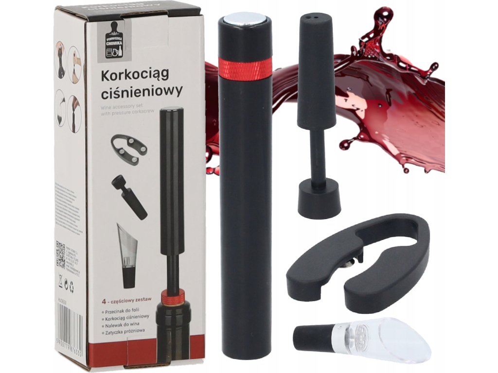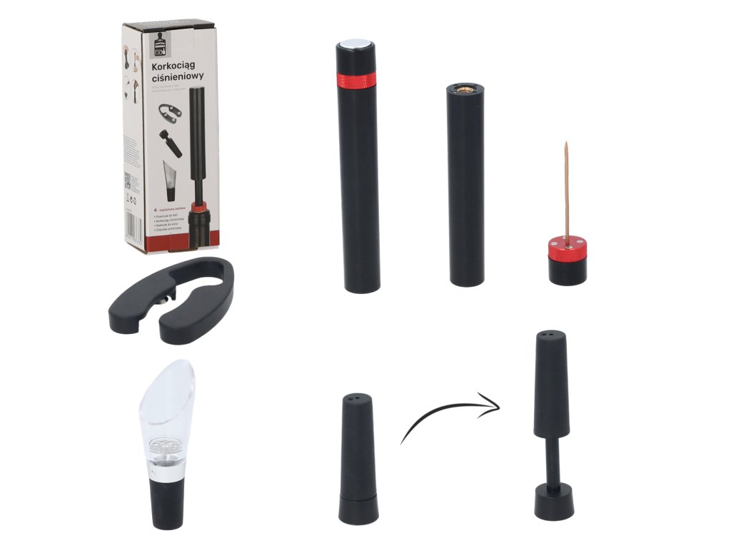 Tlakový otvárač na víno v súprave s užitočnými doplnkami môže poslúžiť ako vynikajúci nápad na darček.V súprave:
