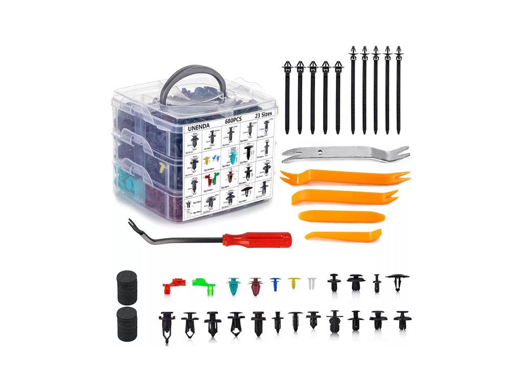 - Kompletná sada: 23 rôznych veľkostí spon pre rôzne automobilové aplikácie, spolu s množstvom nástrojov potrebných pre ich montáž a demontáž.