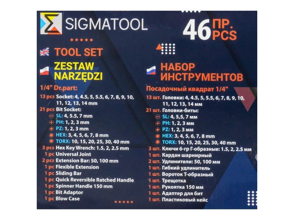 SÚPRAVA NÁSTRČNÝCH KĽÚČOV 1/4" 46 kusov TORX HEX PZ PH v kufri