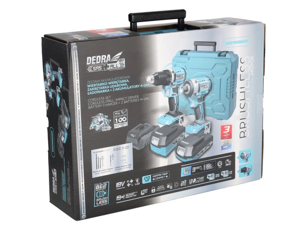 - Akumulátorová vŕtačka so skrutkovačom na bezkartáčovom motore DEDRA SAS+ALL DED7143