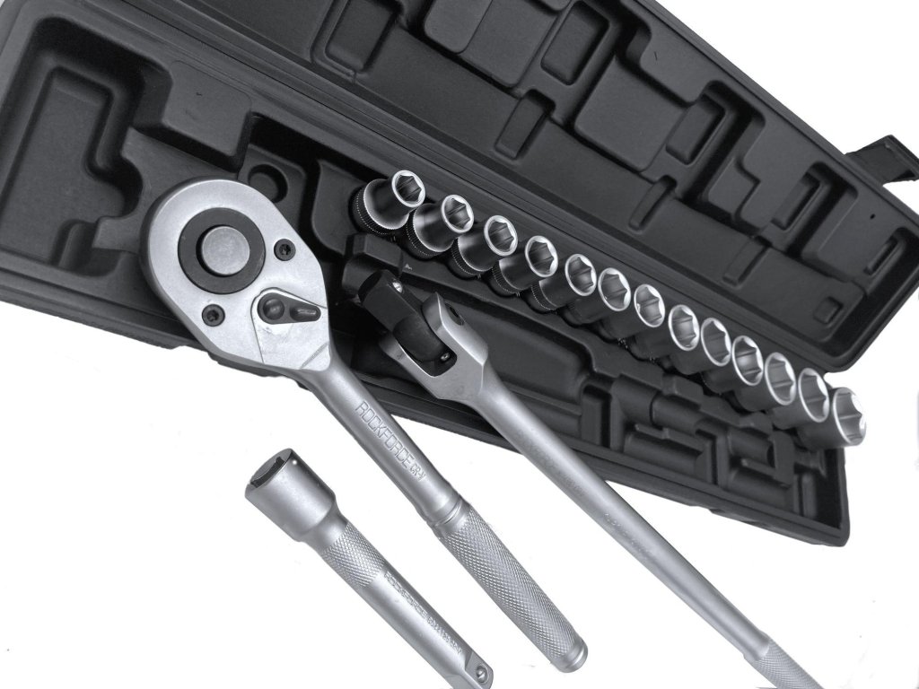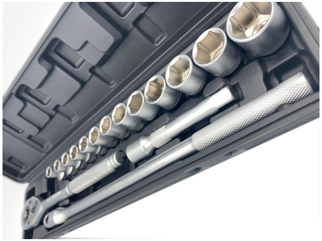 Sada šesťhranných nástavcov, skladá sa z 17 prvkov. Obsahuje šesťhranné nástavce v populárnych veľkostiach od 10 do 27 mm, ako aj račňu s ryhovanou rukoväťou, lomenú rukoväť a nástavce