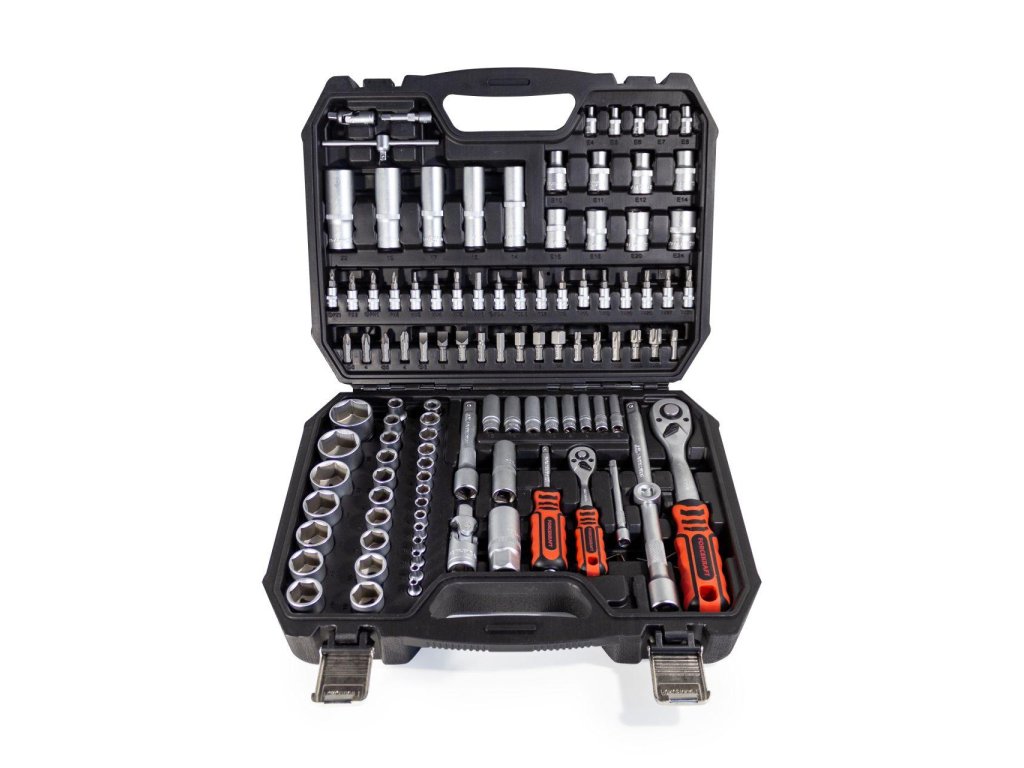 Celý súbor náradia je umiestnený v veľmi odolnom a ergonomickom plastovom kufri, ktorý umožňuje jednoduché prenášanie a uskladnenie súpravy.