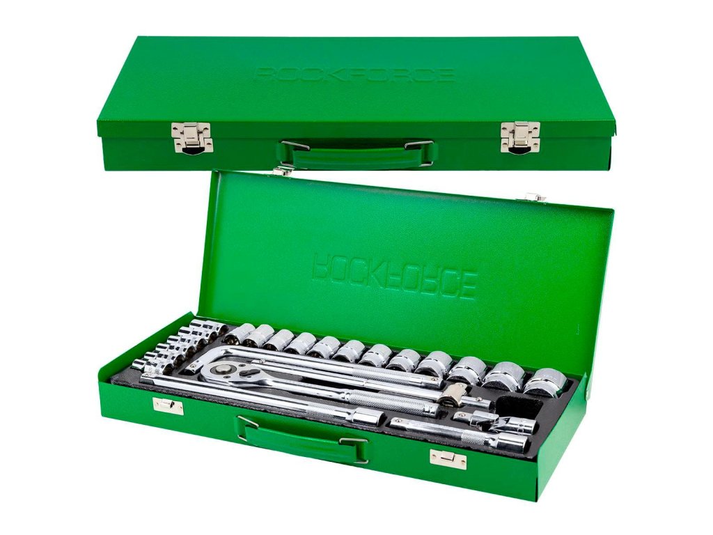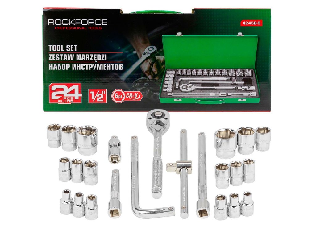 - Sada pozostáva z 24 prvkov v kovovej kazete. Obsahuje kľúče, predĺženia, nástrčky, račňu a kardan.