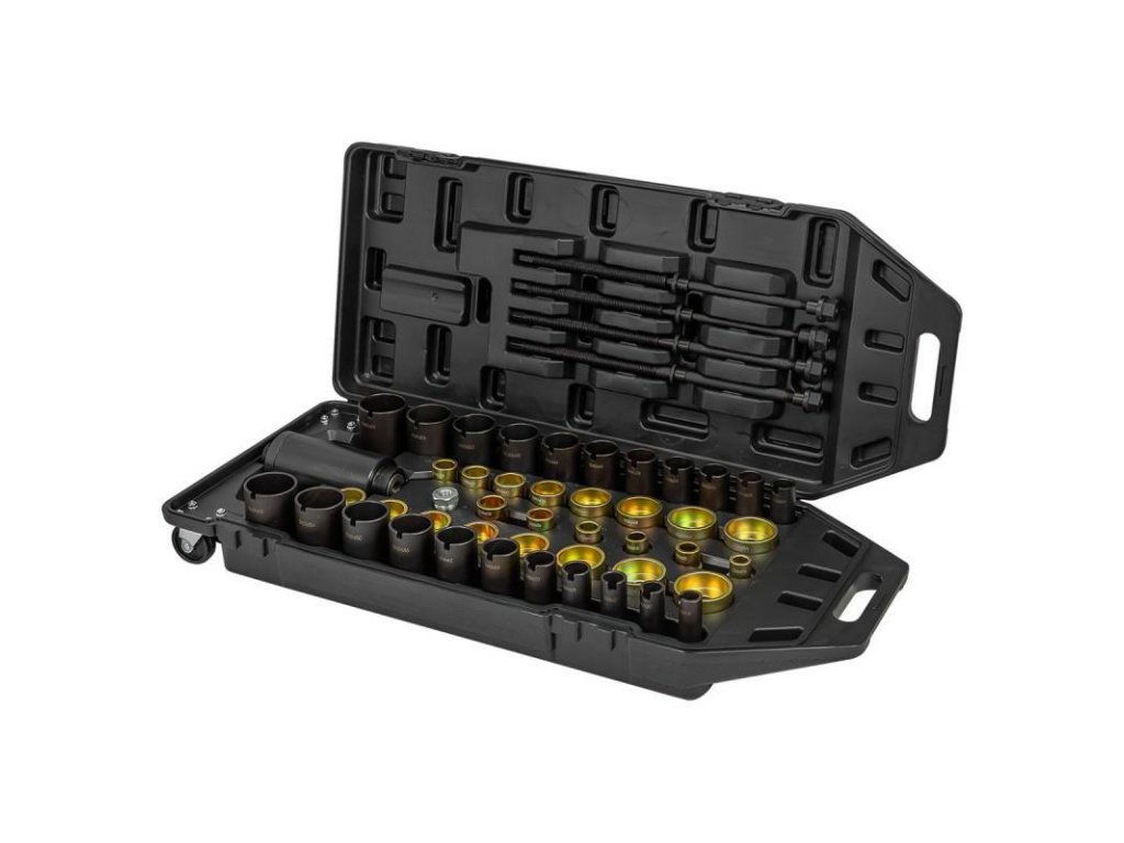 Hlavný hydraulický valec s adaptérom na pripojenie k hadici hydraulického čerpadla, 4 ťažné hriadele so závitmi M10x1.5, M12x1.75, M14x2 a M16x2 a súpravu puzdier s výškou 40 a 110 mm, čo je dostatočné pre prácu s takmer každým automobilom. Pozor!!! Sada neobsahuje hydraulické čerpadlo! Je potrebné ho zakúpiť samostatne alebo použiť z iných hydraulických nástrojov, lisov, žeriavov atď.