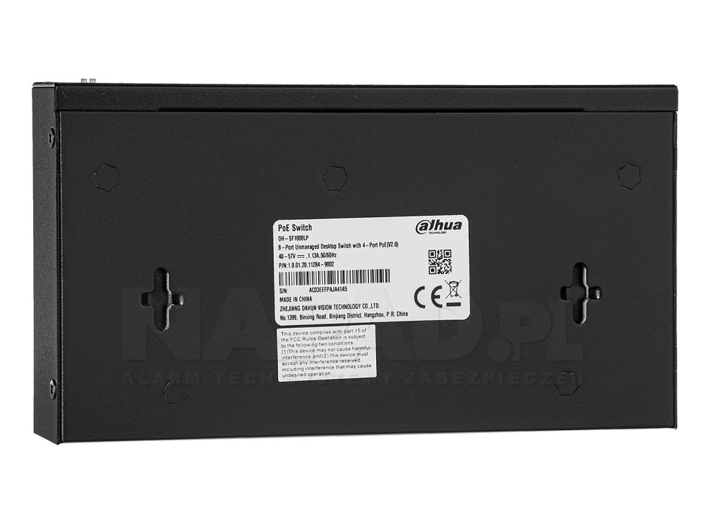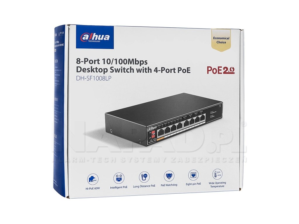 Priemyselný PoE prepínač SF1008LP firmy DAHUA je určený na prácu s veľkými video prúdmi v monitorovacích systémoch CCTV IP. Umožňuje bezproblémovú nepretržitú prevádzku 24h sedem dní v týždni. Zariadenie má 8 portov RJ45 10/100Mbps s podporou technológie PoE 802.3af/at (power over ethernet), ako aj ochranu pred bleskami a diferencovaním potenciálov medzi zariadeniami.