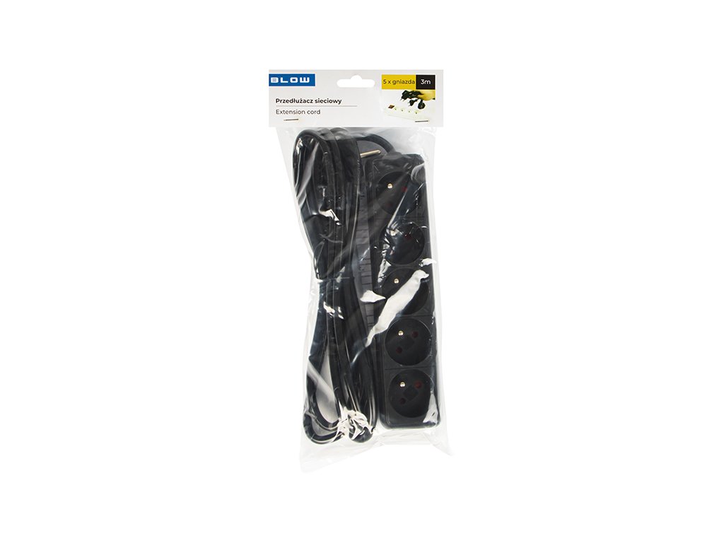 Sieťová predlžovačka BLOW v čiernej farbe s tromi zásuvkami určená na domáce použitie. Predlžovačka umožňuje pripojiť zariadenia, ktoré sú vzdialené od elektrickej zásuvky. Produkt má na jednej strane 3 zásuvky otočené pod uhlom a vypínač, na druhej strane jediný uhlový sieťový konektor.