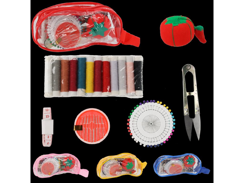 Sada na šitie 6 kusov. Obsahuje: 16 ihiel, 150 cm meraciu pásku, nožnice, 12 kusov 10 m nití v rôznych farbách, guľôčku na zapichovanie ihiel a 40 kusov špendlíkov s perličkovými koncami. Všetko je zabalené do priehľadného, na zips otvárateľného puzdra.Dodatočné parametre