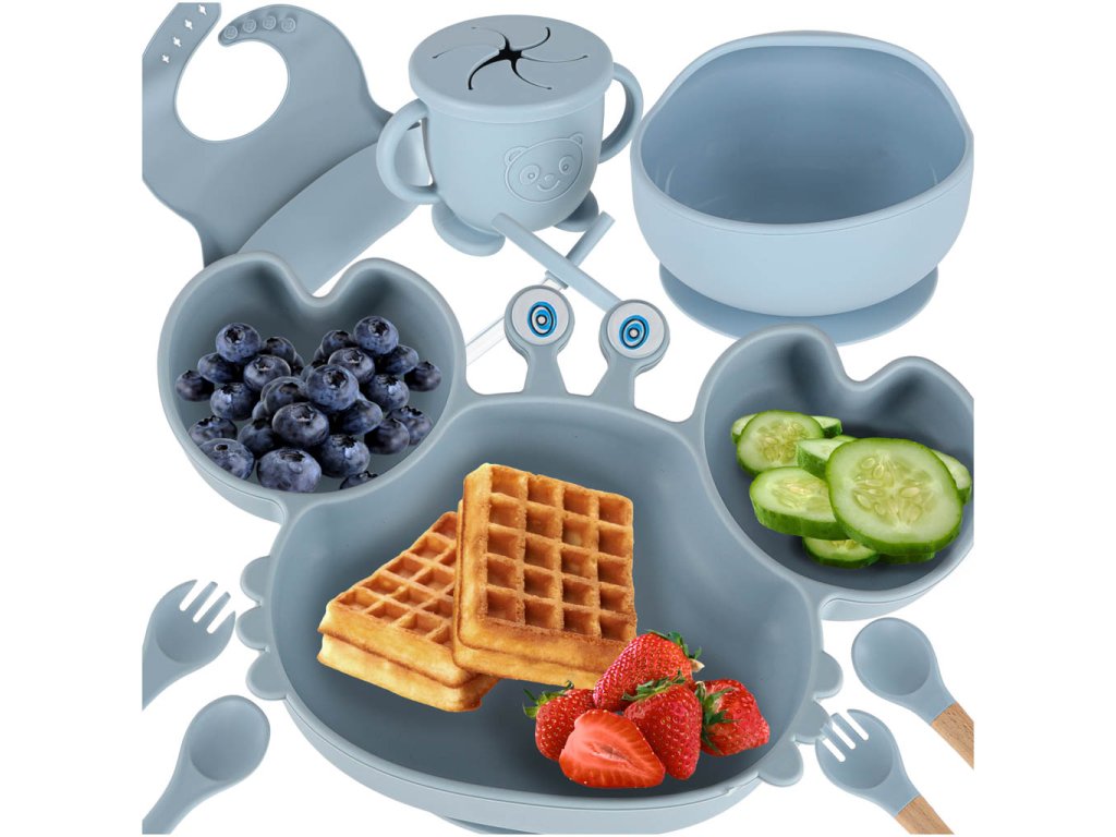 Súprava obsahuje všetky potrebné doplnky, ako je tanier v tvare kraba, miska s krytom, ktorý zabraňuje vysypaniu a rozsypaniu jedla, pohár s dvoma viečkami (vrátane jedného so slamkou), príbor (niektoré s drevenými časťami) a podbradník. S touto súpravou bude vaše dieťatko pripravené na každé jedlo!