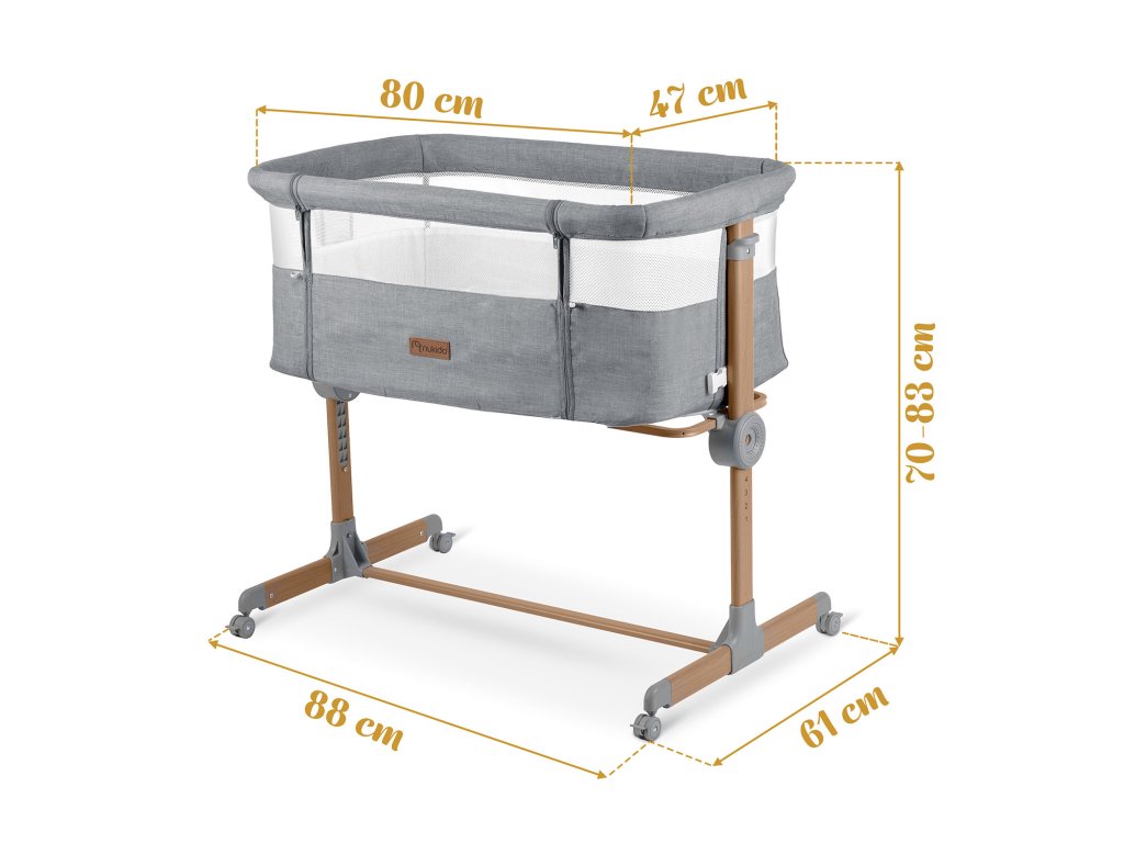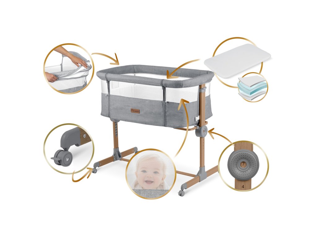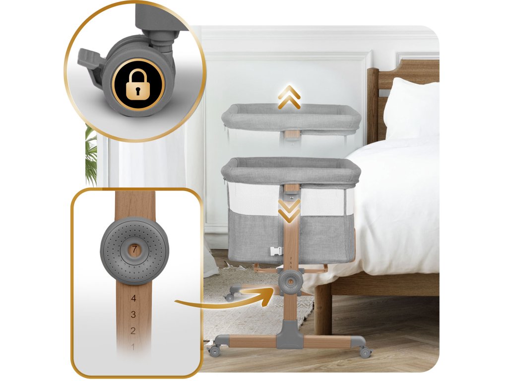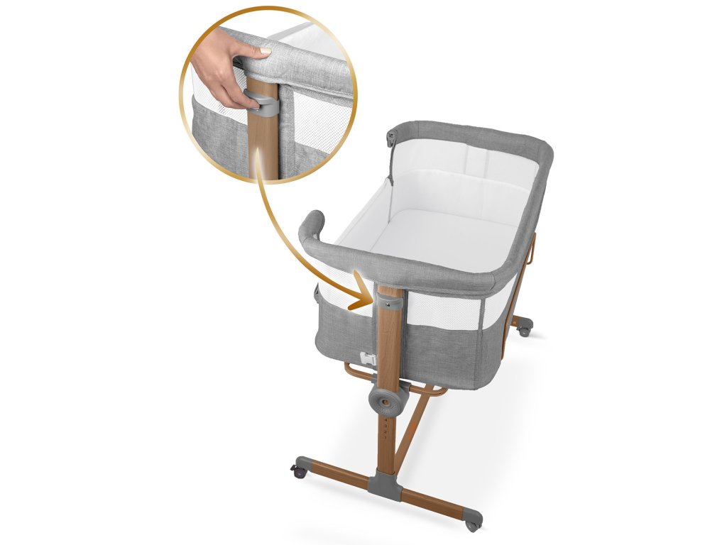 - Detská postieľka má možnosť nezávislého nastavenia výšky na oboch stranách, čo umožňuje prispôsobiť ju úrovni postele rodičov a súčasne zabezpečuje pohodlie pre dieťa aj rodičov.